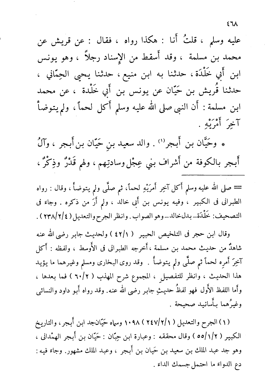 عَلَيْهِ وَسَلَّمَ قُلْتُ أَنَا هَكَذَا رَوَاهُ فَقَالَ عَن قُرَيْش عَن مُحَمَّد بْن مسلمة وَقد أسقط من الإِسناد رجلا وَهُوَ يُونُس ابْن أَبِي خَلْدَة حَدَّثَنَا بِهِ ابْنُ مَنِيعٍ حَدَّثَنَا يَحْيَى الْحِمَّانِيُّ حَدَّثَنَا قُرَيْشُ بْنُ حَيَّانَ عَنْ يُونُسَ بْنِ أَبِي خَلْدَةَ عَنْ مُحَمَّدِ ابْن مَسْلَمَةَ أَنَّ النَّبِيَّ صَلَّى اللَّهُ عَلَيْهِ وَسَلَّمَ أَكَلَ لَحْمًا وَلَمْ يَتَوَضَّأْ آخِرَ أَمْرَيهِ
