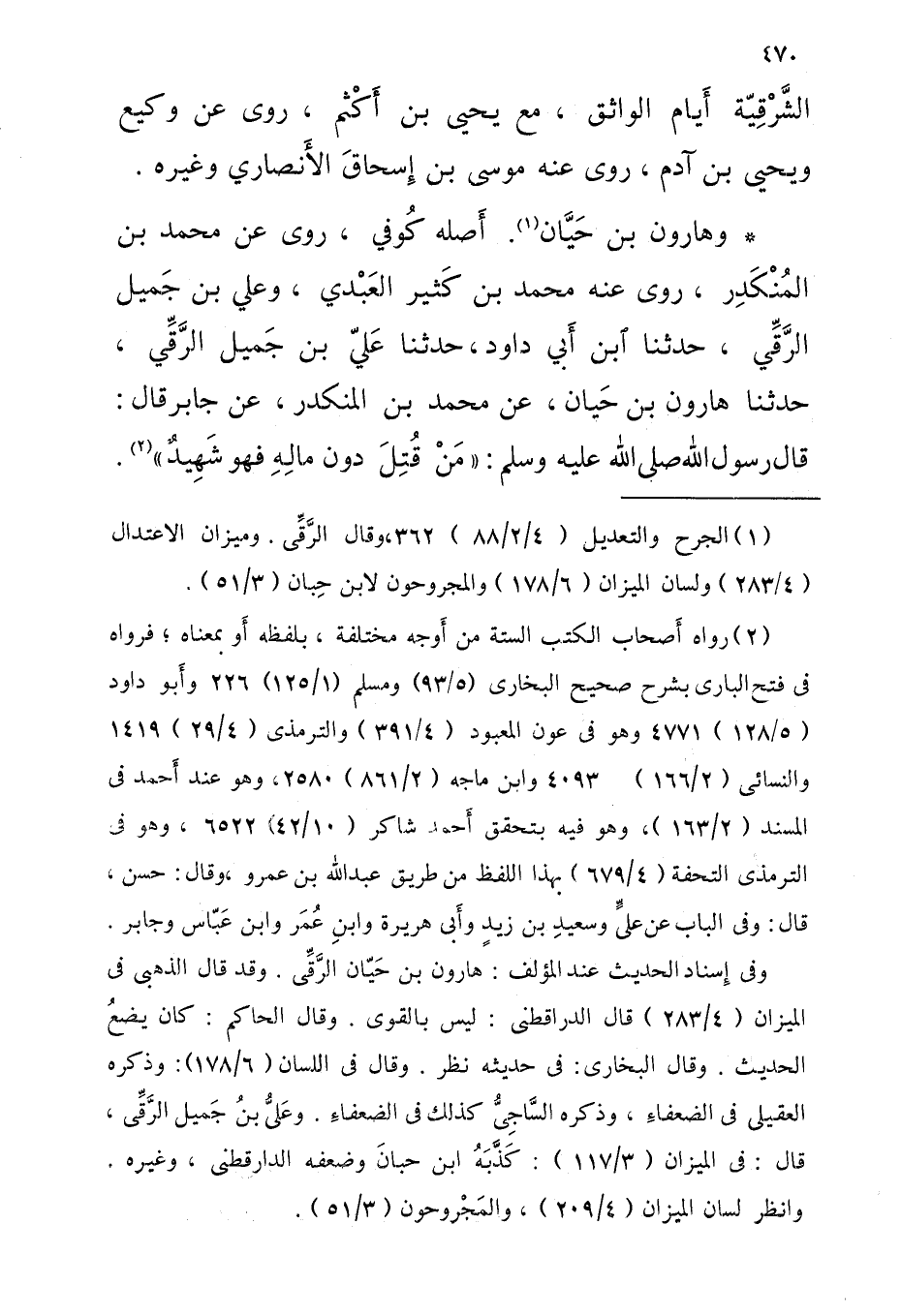وَهَارُون بْن حَيَّان أَصله كُوفي روى عَن مُحَمَّد بْن المُنْكَدِر روى عَنْهُ مُحَمَّد بن كَثير العَبْدي وَعلي بْن جَميل الرَّقِّي حَدَّثَنَا ابْنُ أَبِي دَاوُدَ حَدَّثَنَا عَلِيُّ بْنُ جَمِيلٍ الرَّقِّيُّ حَدَّثَنَا هَارُونُ بْنُ حَيَّانَ عَنْ مُحَمَّدِ بْنِ الْمُنْكَدِرِ عَنْ جَابِرٍ قَالَ قَالَ رَسُول اللَّهِ صَلَّى اللَّهُ عَلَيْهِ وَسَلَّمَ مَنْ قُتِلَ دُونَ مَالِهِ فَهُوَ شَهِيدٌ