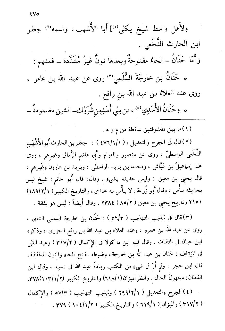 ولأَهل وَاسِط شيخ يكنى] أَبا الْأَشْهب واسْمه جَعْفَر ابْن الْحَارِث النَّخَعي وَأما حَنَانُ الحاءُ مفتوحةٌ وَبعدهَا نونٌ غيرُ مُشَدَّدة فَمنهمْ