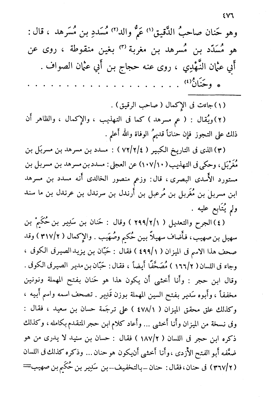 وَهُوَ حَنان صاحبُ الدَّقيق عَمُّ وَالِد مُسَدِد بْن مُسَرهد قالَ هُوَ مُسَدّد بْن مُسرهد بْن مغربة بغين منقوطة روى عَن أَبِي عُثْمَان النَّهْدِي روى عَنْهُ حجاج بْن أَبِي عُثْمَان الصَّواف