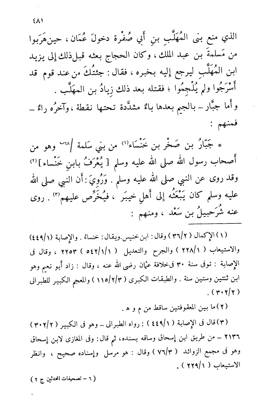 حبار بْن صَخْر بْن خَنْسَاء من بني سَلمَة 68 ب وَهُوَ من أَصْحَاب رَسُول اللَّه صلى الله عَلَيْهِ وَسلم [يُعْرَفُ بابنِ خَنْساء] وَقد روى عَن النَّبِيَّ صَلَّى اللَّهُ عَلَيْهِ وَسَلَّمَ وَرُوِيَ أَن النَّبِيّ صلى الله عَلَيْهِ وَسلم كَانَ يَبْعَثُه إِلى أَهلِ خَيبرَ فيُخَرِّص عَلَيْهِم روى عَنْهُ شُرَحبيلُ بْن سَعْد وَمِنْهُم