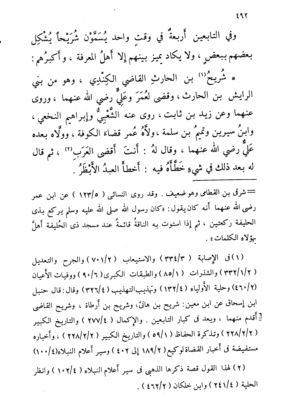 وَفِي التَّابِعين أَربعةٌ فِي وقتٍ وَاحِد يُسَمَّوْن شُرَيْحًا يُشْكِل بَعضهم ببعضٍ وَلَا يكَاد يُمَيّز بَينهم إِلا أَهلُ الْمعرفَة وأَكبرُهم