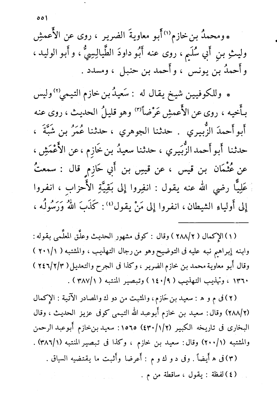 وللكوفيين شيخ يُقَالُ لَهُ سَعِيد بْن خازم التَّيْمِيّ وَلَيْسَ بأَخيه روى عَن الْأَعْمَشُ عرضا وَهُوَ قليلُ الحَدِيث روى عَنْهُ أَبُو أَحْمَد الزبيرِي حَدَّثَنَا الْجَوْهَرِيُّ حَدَّثَنَا عُمَرُ بْنُ شَبَّةَ حَدَّثَنَا أَبُو أَحْمَدَ الزُّبَيْرِيُّ حَدَّثَنَا سعيد بن خازم عَن الْأَعْمَشُ عَنْ عُثْمَانَ بْنِ قَيْسٍ عَنْ قَيْسِ بْنِ أَبِي حَازِمٍ قَالَ سَمِعْتُ عَلِيًّا رَضِيَ اللَّهُ عَنْهُ يَقُولُ انْفِرُوا إِلَى بَقِيَّةِ الأَحْزَابِ انْفِرُوا إِلَى أَوْلِيَاءِ الشَّيْطَانِ انْفِرُوا إِلَى مَنْ يَقُولُ كَذَبَ اللَّهُ وَرَسُولُهُ