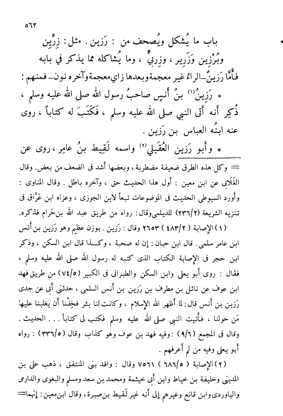 - بَاب مَا يُشكل ويُصحَّفُ من رزين مثل زرين وبرزين وزرير وزربيٍّ وَمَا يُشاكله مِمَّا يذكر فِي بَابه فأَمَّا رَزينٌ الراءُ غير مُعْجمَة وَبعدهَا زَاي مُعْجمَة وَآخره نون فَمنهمْ رَزِينُ بْنُ أَنسٍ صاحبُ رَسُول اللَّه صلى الله عَلَيْهِ وَسلم ذُكِر أَنه أَتى النَّبِيّ صلى الله عَلَيْهِ وَسلم فَكَتَبَ لَهُ كتابا روى عَنْهُ ابنُه الْعَبَّاس بْن رَزين
