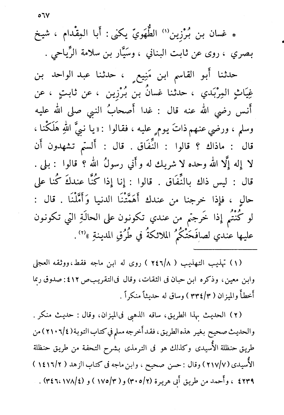 حثدنا أَبُو الْقَاسِم ابْن مَنِيعٍ حَدَّثَنَا عَبْدُ الْوَاحِدِ بْنُ غِيَاثٍ الْمِرْبَدِيُّ حَدَّثَنَا غَسَّانُ بْنُ بُرْزِينَ عَنْ ثَابِتٍ عَنْ أَنَسٍ رَضِيَ اللَّهُ عَنْهُ قَالَ غَدَا أَصْحَابُ النَّبِيِّ صَلَّى اللَّهُ عَلَيْهِ وَسلم وَرَضي عَنْهُم ذاات يَوْمٍ عَلَيْهِ فَقَالُوا يَا نَبِيَّ اللَّهِ هَلَكْنَا قَالَ مَا ذَاكَ قَالُوا النِّفَاقُ قَالَ أَلَسْتُمْ تَشْهَدُونَ أَنْ لَا إِلَهَ إِلا اللَّهُ وَحْدَهُ لَا شَرِيكَ لَهُ وَأَنِّي رَسُولُ اللَّهِ قَالُوا بَلَى قَالَ لَيْسَ ذَاكَ بِالنِّفَاقِ قَالُوا إِنَّا إِذَا كُنَّا عِنْدَكَ كُنَّا عَلَى حَال فَإِذا خرجنَا من عندل أَهَمَّتْنَا الدُّنْيَا وَأَمَّلْنَا قَالَ لَوْ كُنْتُمْ إِذَا خَرَجْتُمْ مِنْ عِنْدِي تَكُونُونَ عَلَى الْحَالَةِ الَّتِي تَكُونُونَ عَلَيْهَا عِنْدِي لَصَافَحَتْكُمُ الْمَلائِكَةُ فِي طُرُقِ الْمَدِينَةِ