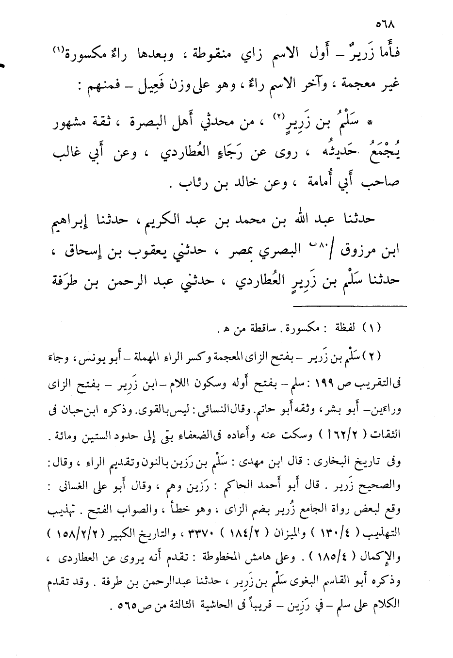 فأَما زَريرٌ أَول الِاسْم زَاي منقوطة وَبعدهَا راءٌ مَكْسُورَة غير مُعْجمَة وَآخر الِاسْم راءٌ وَهُوَ عَلَى وزن فَعِيل فَمنهمْ