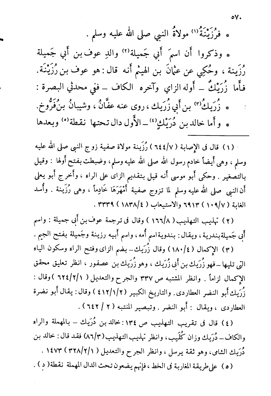 وَذكروا أَن اسْم أبي جميلَة والدِ عَوْف بْن أَبِي جميلَة رُزَينة وحُكِي عَن عُثْمَان بن الْهَيْثَم أَنه قالَ هُوَ عَوْف بْن رُزَيْنَة فأَما زريك أَوله الزا ي وَآخره الْكَاف فَفِي محدثي الْبَصْرَة