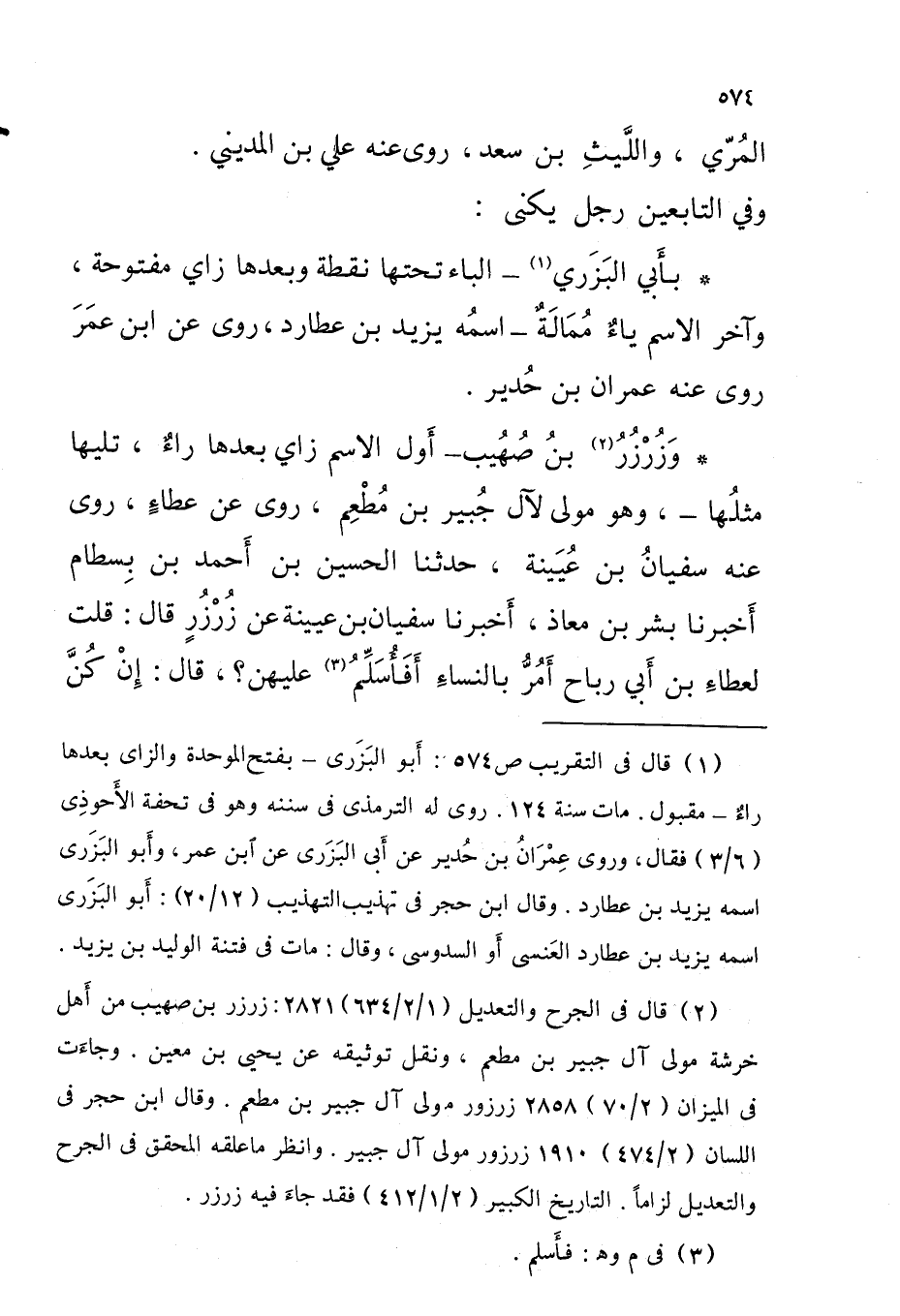 وَزُرْزُرُ بْنُ صُهَيْب أول الِاسْم زَاي بعْدهَا راءٌ تَلِيهَا مثلُها وَهُوَ مَوْلَى لآل جُبَيْر بْن مُطْعِم روى عَن عَطاء روى عَنْهُ سُفْيَان بْن عُيَيْنَةَ حَدَّثَنَا الْحُسَيْن بْن أَحْمَد بْن بسطَام أخبرنَا بشر بْن مُعَاذ أخبرنَا سُفْيَان بْن عُيَيْنَةَ عَن زُرْزُرٍ قالَ قلتُ لعطاءِ بْن أَبِي رَبَاح أَمُرُّ بِالنسَاء أَفأَسَلِّمُ عَلَيْهِنَّ قالَ إنْ كُنَّ