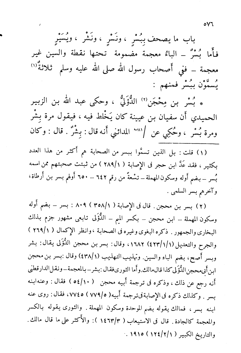 - بَابُ مَا يصحف بِبُسْرٍ ونَسْرٍ ونَشْر ويُسَيْرٍ فأَما بُسْرٌ الباءُ مُعْجمَة مَضْمُومَة تحتهَا نقطة وَالسِّين غير مُعْجمَة فَفِي أَصحاب رَسُول اللَّهِ صَلَّى اللَّهُ عَلَيْهِ وَسَلَّمَ ثلاثةٌ يُسمْون ببُسْر فَمنهمْ