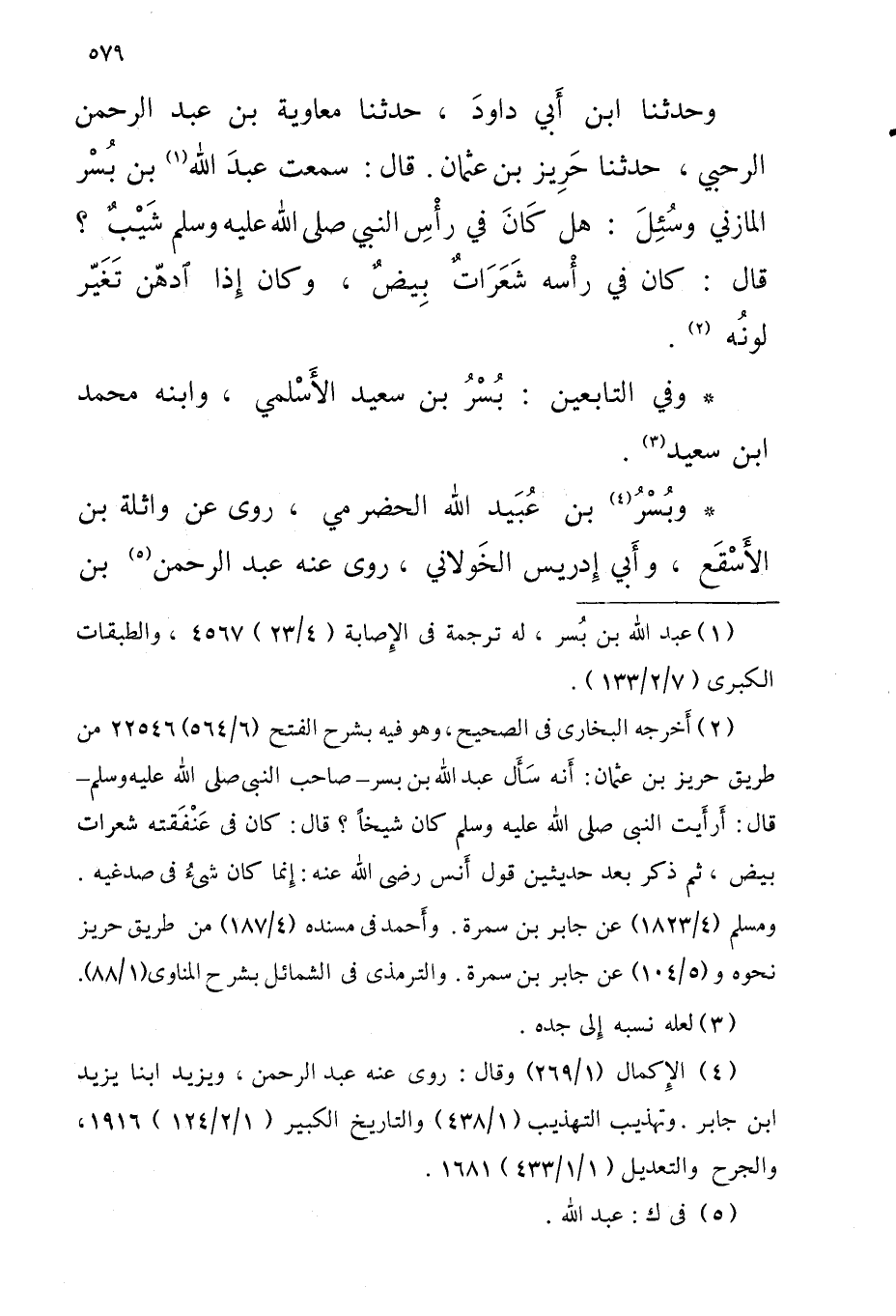 وَحَدَّثَنَا ابْنُ أَبِي دَاوُدَ حَدَّثَنَا مُعَاوِيَةُ بْنُ عَبْدِ الرَّحْمَنِ الرَّحْبِيُّ حَدَّثَنَا حُرَيْزُ بْنُ عُثْمَانَ قَالَ سَمِعْتُ عَبْدَ اللَّهِ بْنَ بُسْرٍ الْمَازِنِيَّ وَسُئِلَ هَلْ كَانَ فِي رَأْسِ النَّبِيِّ صَلَّى اللَّهُ عَلَيْهِ وَسَلَّمَ شَيْبٌ قَالَ كَانَ فِي رَأْسِهِ شَعَرَاتٌ بِيضٌ وَكَانَ إِذَا ادَّهَنَ تَغَيَّرَ لَوْنُهُ