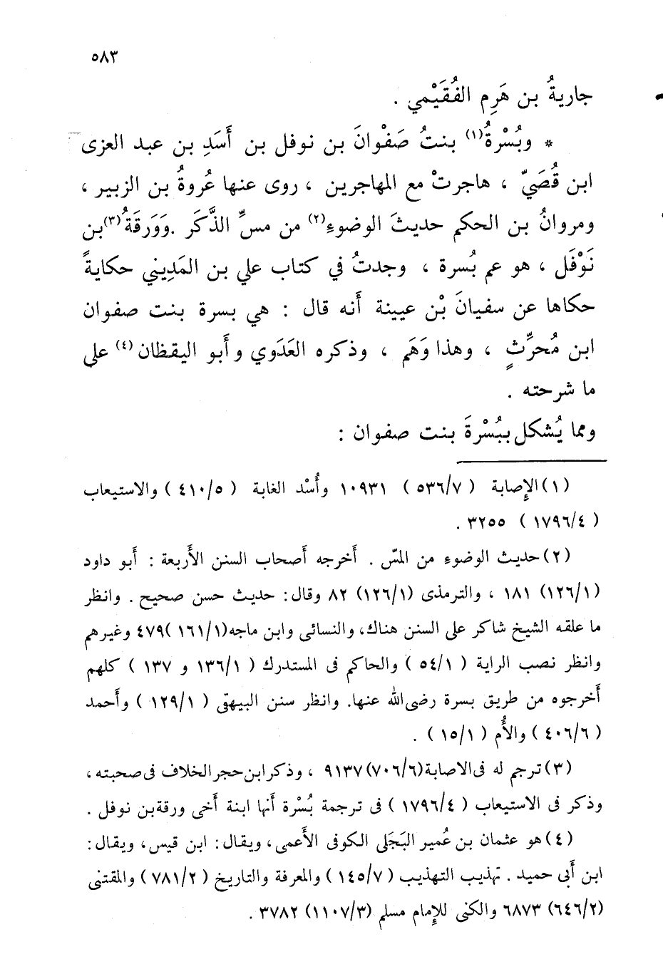 وبُسْرةُ بِنْت صَفْوَان بْن نَوْفَل بْن أَسد بن عبد الْعُزَّى ابْن قصي هَاجَرت مَعَ الْمُهَاجِرين روى عَنْهَا عُروةُ بْن الزبير ومروانُ بْن الحكم حديثَ الوضوءِ من مس الذّكر ورقة بْن نَوْفَل هُوَ عَم بُسرة وجدتُ فِي كتاب عَليّ بْن الْمَدِينِيّ حِكَايَة حَكَاهَا عَن سُفْيَان بْن عُيَيْنَةَ أنَّه قالَ هِيَ بسرة بنت صَفْوَان ابْن مُحرِّثٍ وَهَذَا وَهَم وَذكره العَدَوي وأَبو الْيَقظَان عَلَى مَا شرحته وَمِمَّا يُشكل ببُسْرةَ بِنْت صَفْوَان