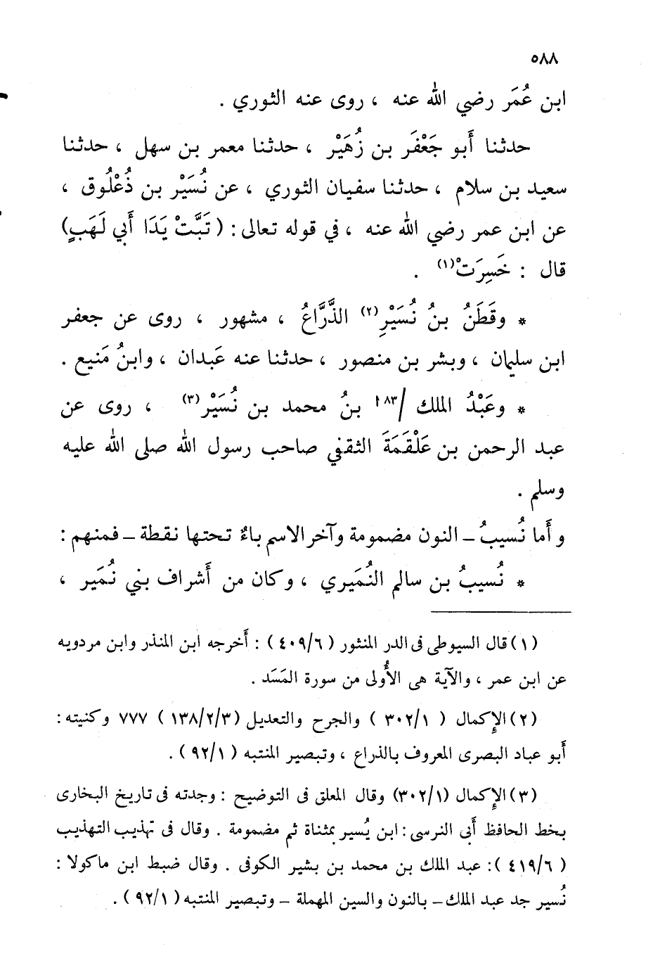 حَدَّثَنَا أَبُو جَعْفَرِ بْنُ زُهَيْرٍ حَدَّثَنَا مَعْمَرُ بْنُ سَهْلٍ حَدَّثَنَا سَعِيدُ بْنُ سَلامٍ حَدَّثَنَا سُفْيَانُ الثَّوْرِيُّ عَنْ نُسَيْرِ بْنِ ذُعْلُوقٍ عَنِ ابْنِ عُمَرَ رَضِيَ اللَّهُ عَنْهُ فِي قَوْله تعال {تبت يدا أبي لَهب} قَالَ خَسِرَتْ