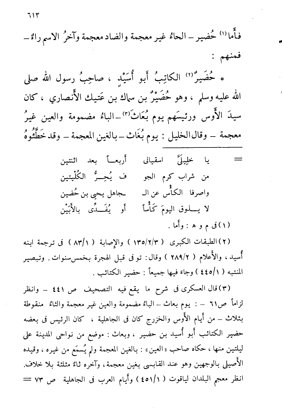 حضير الْكَاتِب أَبُو أسيدٍ صَاحب رَسُول اللَّه صلى الله عَلَيْهِ وَسلم وَهُوَ حُضَيْرٌ بْن سماك بْن عَتيك الأَنصاري كَانَ سيد الأَوس وَرَئِيسهمْ يَوْم بُعَاث الباءُ مَضْمُومَة وَالْعين غيرُ مُعْجمَة وَقَالَ الْخَلِيل يَوْم بُعَاث بالغين الْمُعْجَمَة وَقد خطئوه