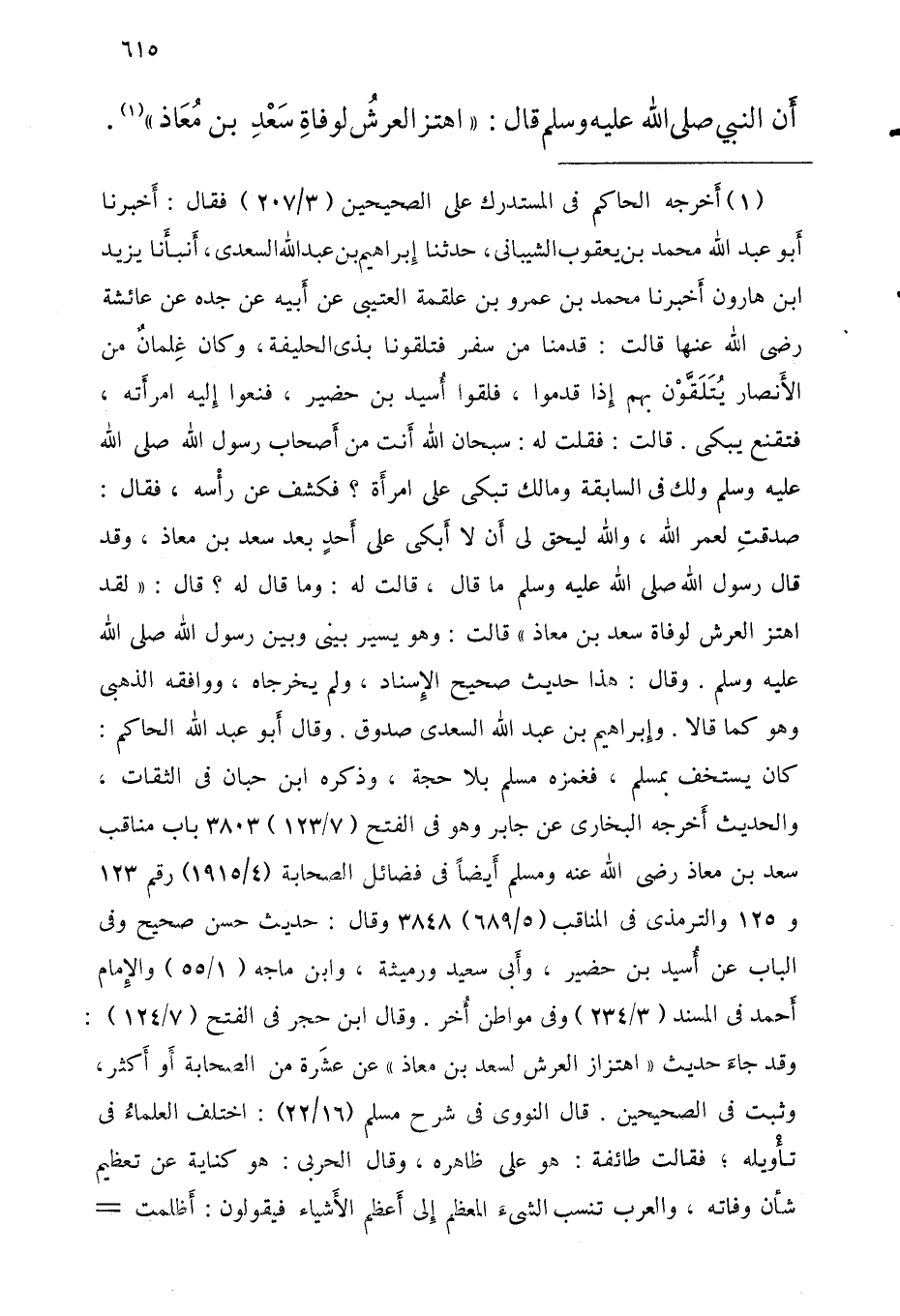 أَنّ النَّبِيَّ صَلَّى اللَّهُ عَلَيْهِ وَسَلَّمَ قَالَ اهْتَزَّ الْعَرْشُ لِوَفَاةِ سَعْدِ بْنِ مُعَاذٍ