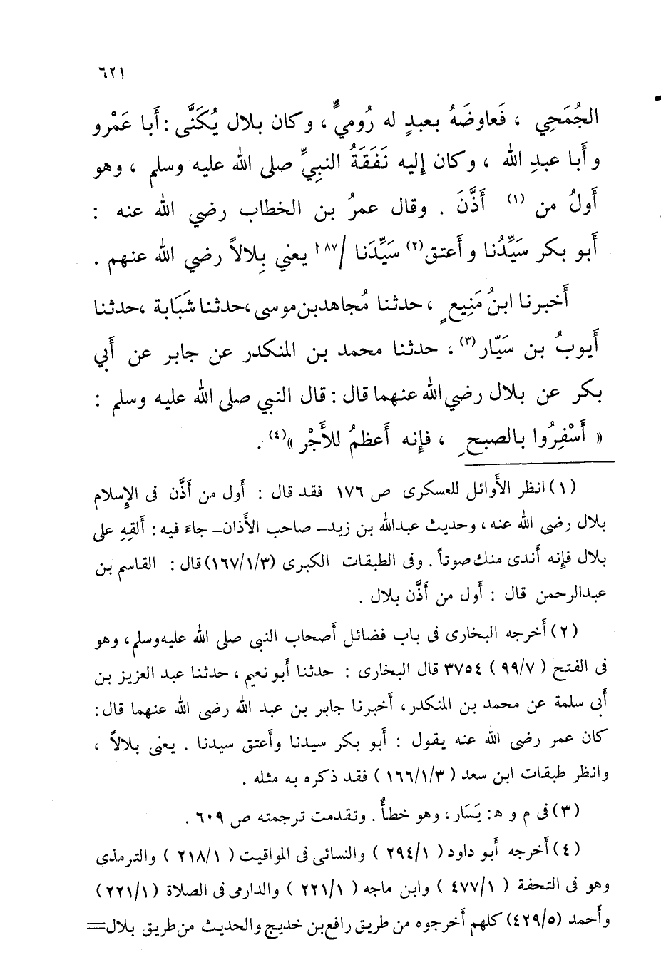 الجُمَحِي فعاوضه بعبدٍ لَهُ رُومي وَكَانَ بِلَال يُكَنَّى أَبَا عَمْرو وَأَبا عَبْد اللَّه وَكَانَ إِلَيْهِ نَفَقَة النَّبِيّ صلى الله عَلَيْهِ وَسلم وَهُوَ أول من أَذَّن وَقَالَ عُمَرُ بْن الْخطاب رَضِيَ اللَّه عَنْهُ أَبُو بَكْر سيدنَا وَأعْتق سيدنَا 87 أيَعْنِي بِلَالًا رَضِي الله عَنْهُم