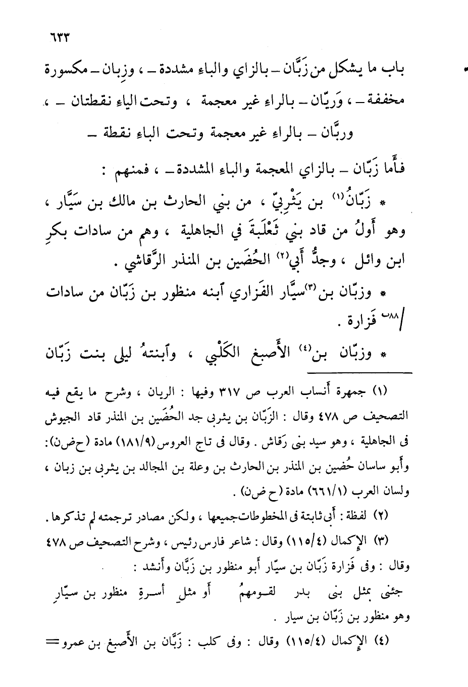 - بَابُ مَا يشكل من زَبَّان بالزاي والباءِ مُشَدّدَة وزِبان مَكْسُورَة مُخَفّفَة وَريّان بالراءِ غير مُعْجمَة وَتَحْت الياءِ نقطتان وربَّان بالراءِ غيرُ معجمةٍ وَتَحْت الباءِ نقطةٌ فأَما زَبَّان بالزاي الْمُعْجَمَة والباءِ الْمُشَدّدَة فَمنهمْ