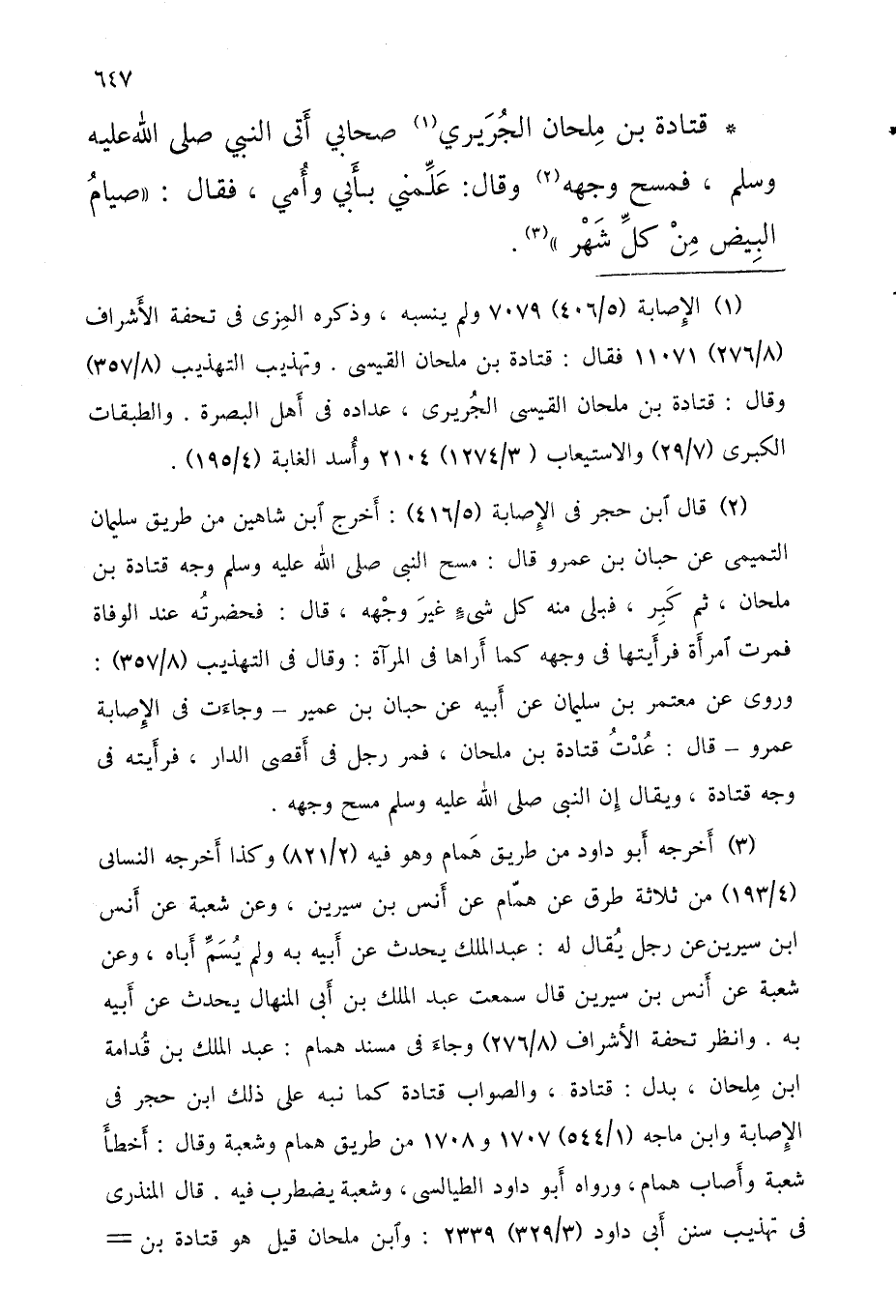 قَتَادَة بْن مِلحان الجُرَيري صَحَابِيّ أَتى النَّبِيّ صلى الله عَلَيْهِ وَسلم فَمسح وَجهه وَقَالَ عَلمنِي بأَبي وأُمي فَقَالَ صيامُ البِيض من كل شهر