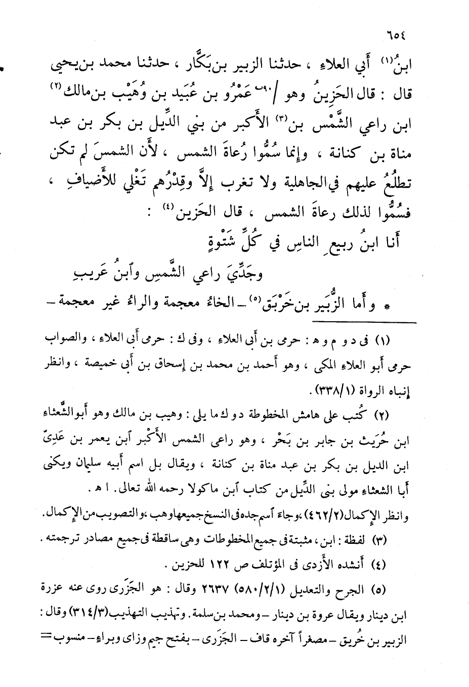 ابْن أَبي العلاءِ حَدَّثَنَا الزبير بْن بكار حَدَّثَنَا مُحَمَّد بْن يحيى قَالَ قَالَ الحزين وَهُوَ 90 ب عَمْرو بْن عُبَيْد بْن وُهَيْب بن مَالك ابْن راعي الشَّمْس بْن الْأَكْبَر من بني الدَّيل بْن بَكْر بْن عَبْد مَنَاة بْن كنَانَة وإِنما سُمُّوا رُعاة الشَّمْس لِأَن الشَّمْس لم تكن تطلُعُ عَلَيْهِم فِي الْجَاهِلِيَّة وَلَا تغرب إِلَّا وقِدْرُهم تغلي لأضياف فسُمُّوا لذَلِك رُعَاة الشَّمْس قالَ الحَزين