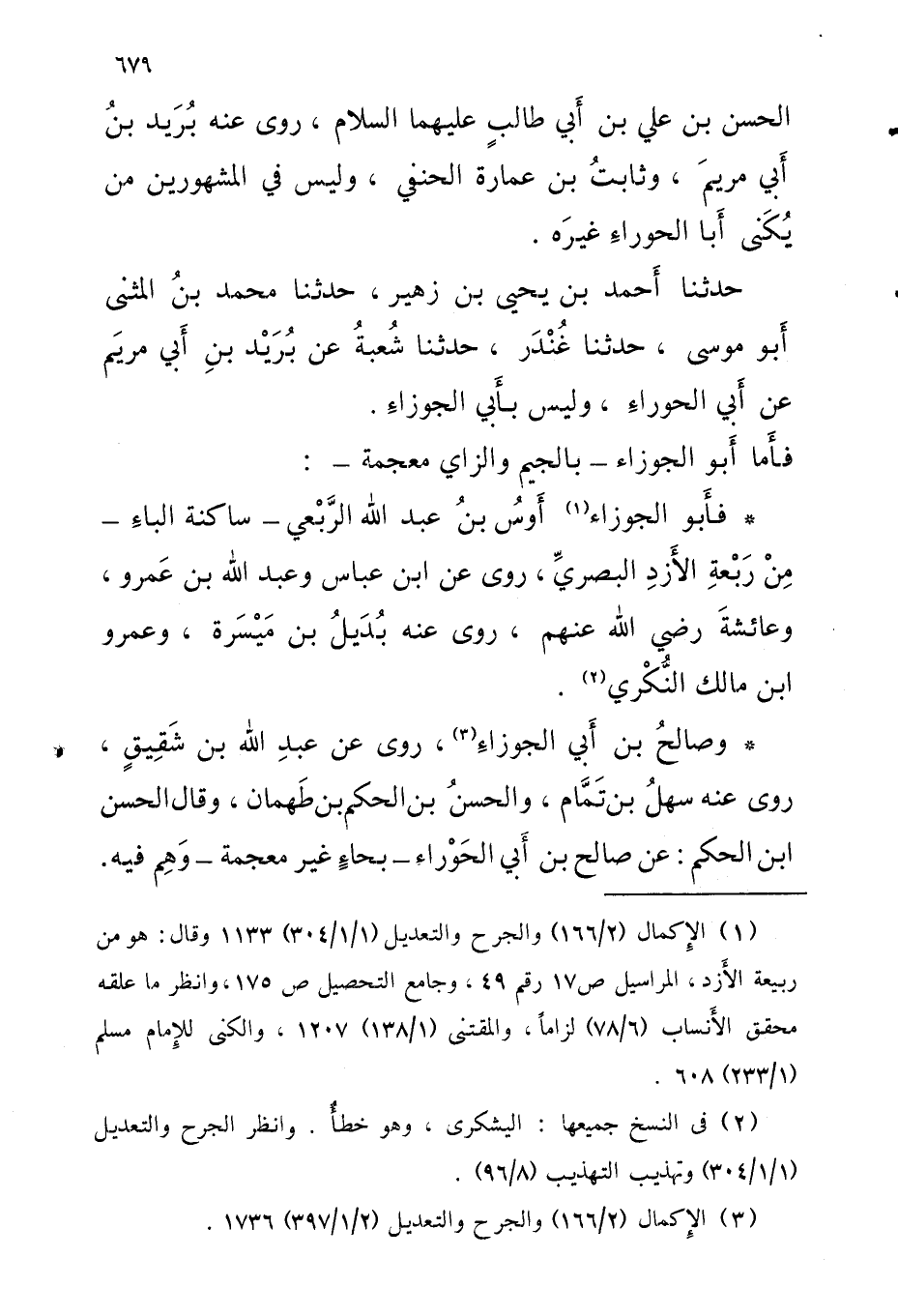 وَصَالح بن أبي الجوزاء روى عَن عَبْد اللَّه بْن شقيقٍ روى عَنْهُ سهلُ بْن تَمام وَالْحسن بْن الحكم بن طهْمَان وَقَالَ الْحسن ابْن الحكم عَن صَالح بْن أَبِي الحَوْراء بحاءِ غير مُعْجمَة وَهِم فِيهِ