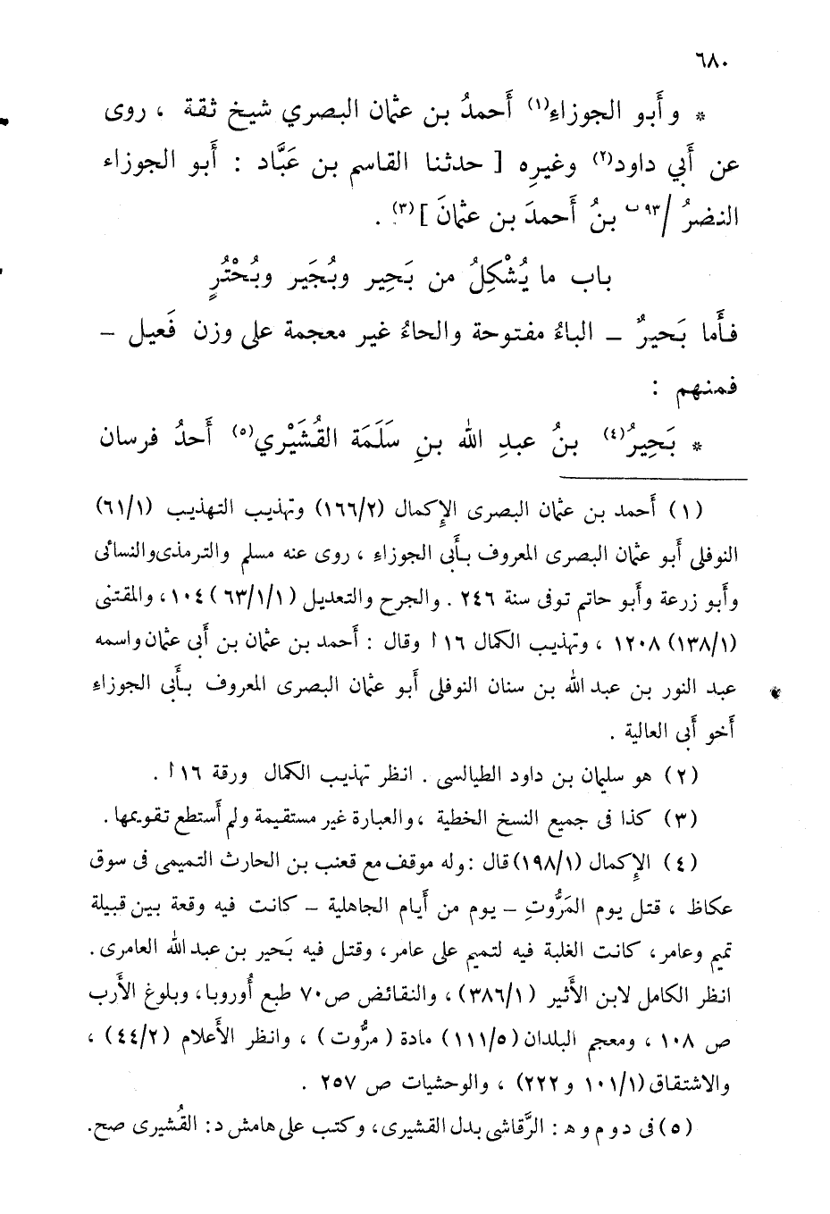 - بَابُ مَا يشكل من بحير وبجير وبُحْتُرٍ فأَما بَحيرٌ الباءُ مَفْتُوحَة والحاءُ غير مُعْجمَة عَلَى وزن فَعيل فَمنهمْ