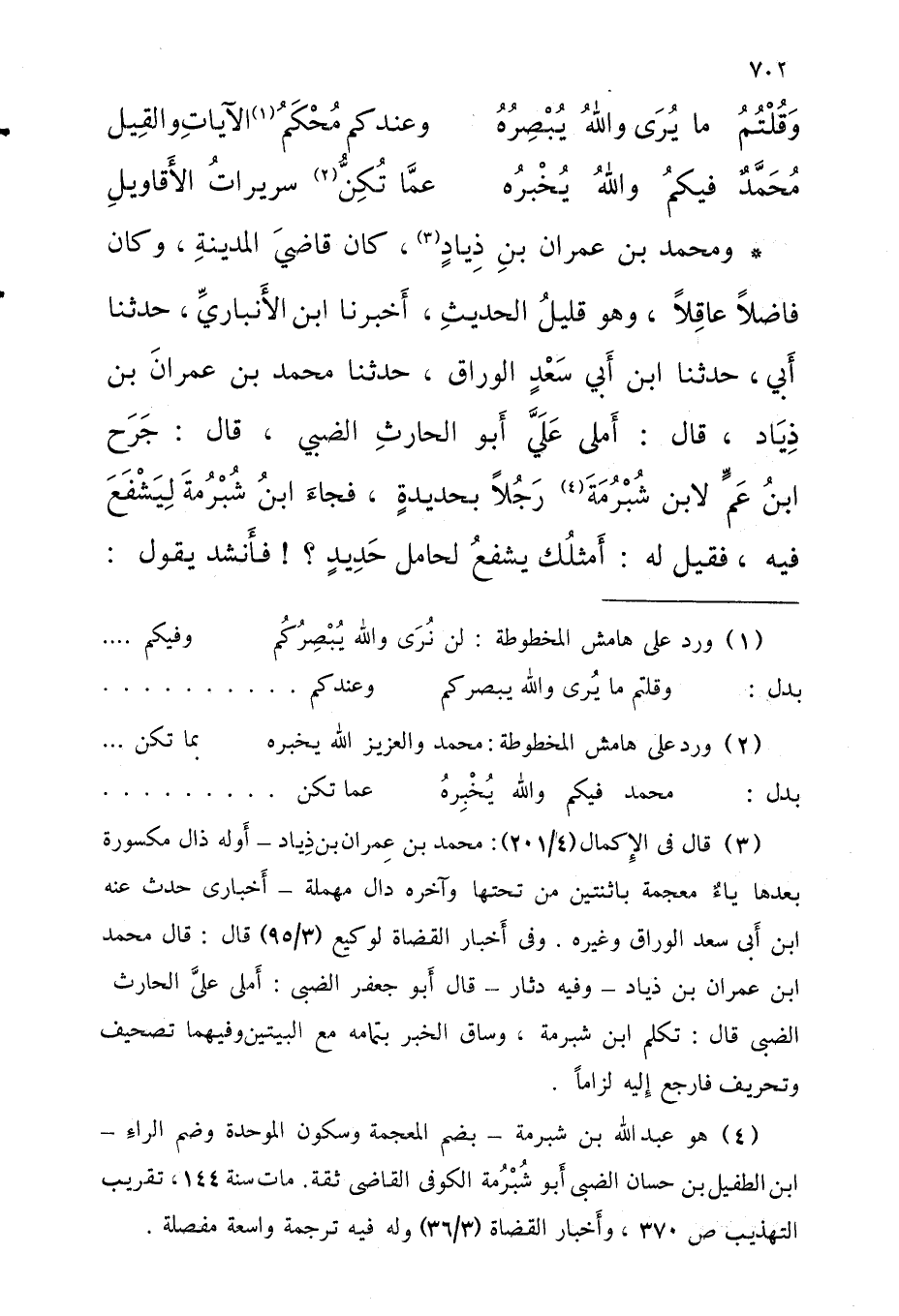وَمُحَمَّدُ بْنُ عِمْرَانَ بْنِ ذِيَادٍ كَانَ قَاضِي الْمَدِينَةِ وَكَانَ فَاضِلا عَاقِلا وَهُوَ قَلِيلُ الْحَدِيثِ أَخْبَرَنَا ابْنُ الأَنْبَارِيِّ حَدَّثَنَا أَبِي حَدَّثَنَا ابْنُ أَبِي سَعْدٍ الْوَرَّاقُ حَدَّثَنَا مُحَمَّدُ بْنُ عِمْرَانَ بْنِ ذِيَادٍ قالَ أَمْلَى عَلَيَّ أَبُو الْحَارِثِ الضَّبِّيُّ قَالَ جَرَح ابنُ عَمٍّ لابْنِ شُبْرُمَةَ رَجُلا بَحَدِيدَةٍ فَجَاءَ ابنُ شُبْرُمَةَ لِيَشْفَعَ فِيهِ فَقِيلَ لَهُ أَمِثْلُكَ يَشْفَعُ لِحَامِلِ حَدِيدٍ فَأَنْشَدَ يَقُولُ