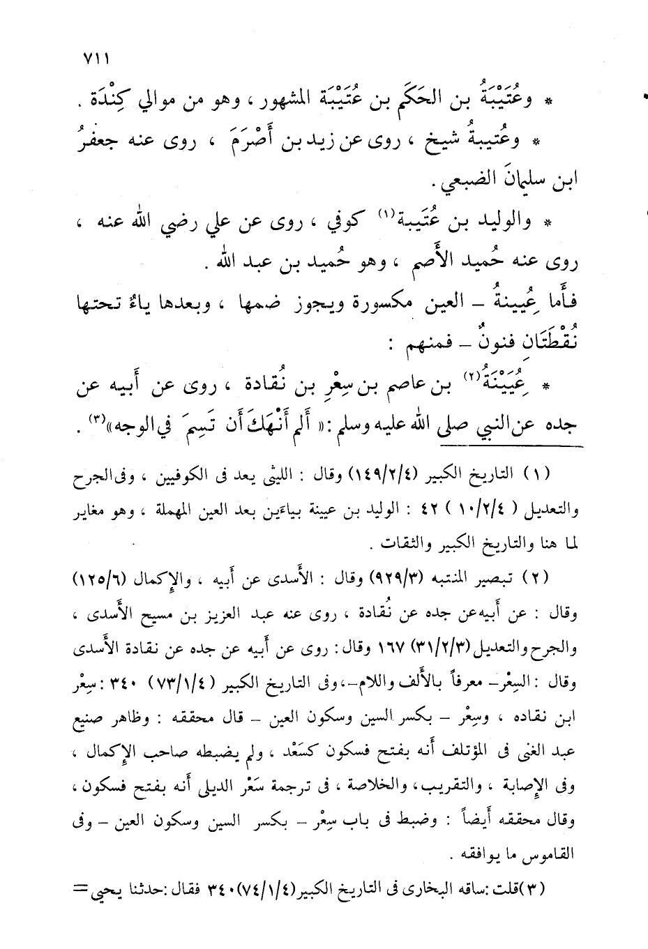 والوليد بْن عُتَيْبَةُ كُوفِي روى عَن عَليّ رَضِيَ اللَّه عَنْهُ روى عَنْهُ حُميد الْأَصَم وَهُوَ حميدُ بْن عَبْد اللَّه فأَما عُيَيْنَةَ الْعين مَكْسُورَة وَيجوز ضمهَا وَبعدهَا ياءٌ تحتهَا نُقْطَتَانِ فنونٌ فَمنهمْ