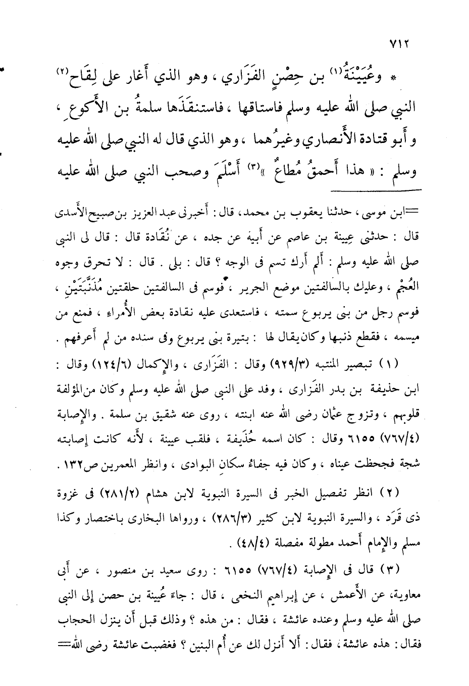 وعيينة بن حصن الْفَزارِيّ وَهُوَ الَّذِي أَغار عَلَى لِقَاح النَّبِيَّ صَلَّى اللَّهُ عَلَيْهِ وَسَلَّمَ فَاسْتَاقَهَا فاستنقَذَها سلمةُ بْن الأَكوعِ وَأَبُو قَتَادَة الْأَنْصَارِيّ وَغَيرهمَا وَهُوَ الَّذِي قالَ لَهُ النَّبِيّ صلى الله عَلَيْهِ وَسلم هَذَا أحمقُ مُطاعٌ أَسْلَم وَصَحب النَّبِيّ صلى الله عَلَيْهِ