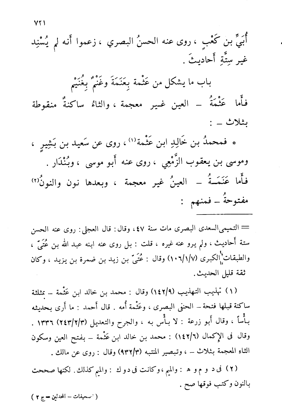 فمحمد بن خَالِد ابْن عَثْمة روى عَن سَعِيد بْن بشيرٍ ومُوسَى بْن يَعْقُوب الزَّمْعِي روى عَنْهُ أَبو مُوسَى وبُنْدَار فأَما عَنَمَةُ العينُ غير مُعْجمَة وَبعدهَا نون والنونُ مَفْتُوحَة فَمنهمْ