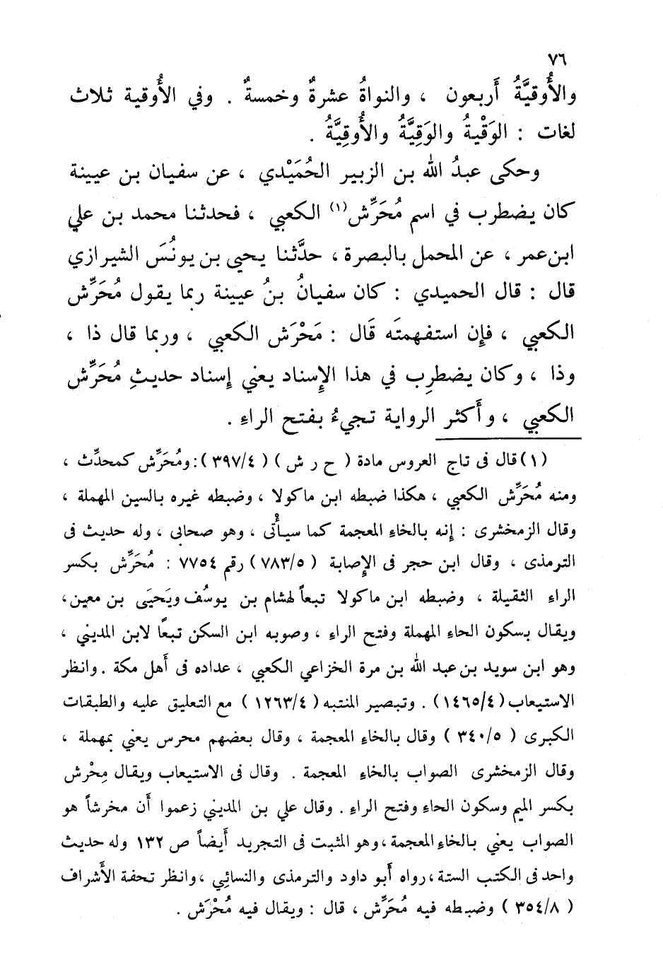 وَحَكَى عَبْدُ اللَّهِ بْنُ الزُّبَيْرِ الْحُمَيْدِيُّ عَنْ سُفْيَانَ بْنِ عُيَيْنَةَ كَانَ يَضْطَرِبُ فِي اسْمِ مُحَرِّشٍ الْكَعْبِيِّ فَحَدَّثَنَا مُحَمَّدُ بن عَليّ ابْن عُمَرَ عَنِ الْمَحْمَلِ بِالْبَصْرَةِ حَدَّثَنَا يَحْيَى بْنُ يُونُسَ الشِّيرَازِيُّ قَالَ قَالَ الْحُمَيْدِيُّ كَانَ سُفْيَانُ بْنُ عُيَيْنَةَ رَبُّمَا يَقُولُ مُحَرِّشٌ الْكَعْبِيُّ فَإِنِ اسْتَفْهَمْتَهُ قَالَ مَحْرَشٌ الْكَعْبِيُّ وَرُبَّمَا قَالَ ذَا وَذَا وَكَانَ يَضْطَرِبُ فِي هَذَا الإِسْنَادِ يَعْنِي إِسْنَادَ حَدِيثِ مُحَرِّشٍ الْكَعْبِيِّ وَأَكْثَرُ الرِّوَايَةِ تَجِيءُ بِفَتْحِ الرَّاءِ