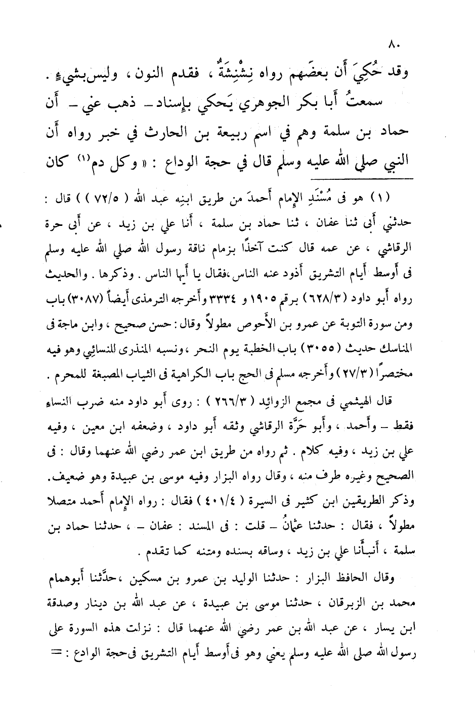 سَمِعْتُ أَبَا بَكْرٍ الَجْوَهْرِيَّ يَحْكِي بِإِسْنَادٍ ذَهَبَ عَنِّي أَنَّ حَمَّادَ بْنَ سَلَمَةَ وَهِمَ فِي اسْمِ رَبِيعَةَ بْنِ الْحَارِثِ فِي خَبَرٍ رَوَاهُ أَنَّ النَّبِيَّ صَلَّى اللَّهُ عَلَيْهِ وَسَلَّمَ قَالَ فِي حَجَّةِ الْوَدَاعِ وَكُلُّ دَمٍ كَانَ