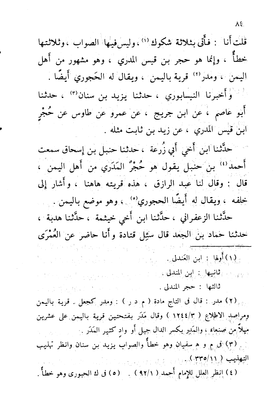 حَدَّثَنَا ابْنُ أَخِي أَبِي زُرْعَةَ حَدَّثَنَا حَنْبَلُ بْنُ إِسْحَاقَ سَمِعْتُ أَحْمَدَ بْنَ حَنْبَلٍ يَقُولُ هُوَ حُجْرٌ الْمَدْرِيُّ مِنْ أَهْلِ الْيَمَنِ قَالَ وَقَالَ لَنَا عَبْدُ الرَّازِقِ هَذِهِ قَرْيَتُهُ هَاهُنَا وَأَشَارَ إِلَى خَلْفِهِ وَيُقَالُ لَهُ أَيْضًا الْحُجُورِيُّ وَهُوَ مَوْضِعٌ بِالْيَمَنِ