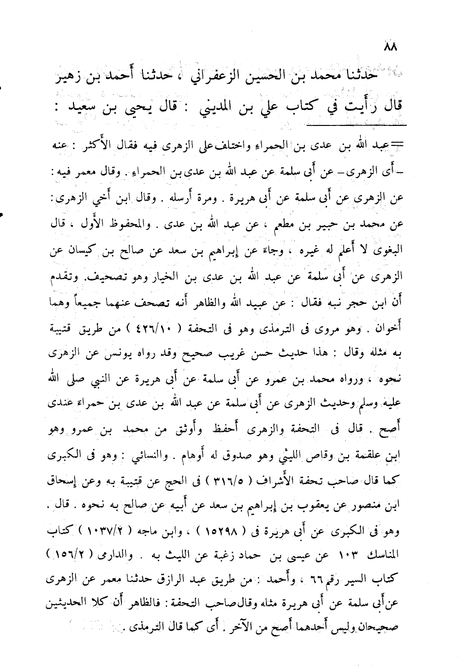 حَدَّثَنَا مُحَمَّدُ بْنُ الْحُسَيْنِ الزَّعْفَرَانِيُّ حَدَّثَنَا أَحْمَدُ بْنُ زُهَيْرٍ قَالَ رَأَيْتُ فِي كِتَابِ عَلِيِّ بْنِ الْمَدِينِيِّ قَالَ يَحْيَى بْنُ سَعِيدٍ