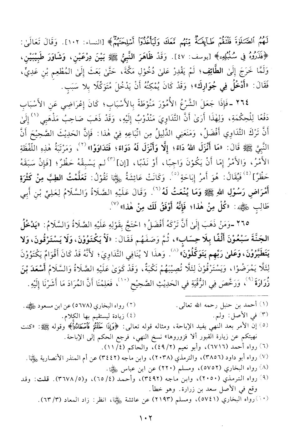 265- ومن ذهب إلى أن تركه أفضل، احتج بقوله عليه الصلاة والسلام: "يدخل الجنة سبعون ألفًا بلا حساب"، ثم وصفهم فقال: "لا يكتوون، ولا يسترقون، ولا يتطيرون، وعلى ربهم يتوكولون"8. وهذا لا ينافي التداوي؛ لأنه قد كان أقوام يكتوون لئلا يمرضوا، ويسترقون لئلا تصيبهم نكبة، وقد كوى عليه الصلاة والسلم أسعد بن زرارة9، ورخص في الرقية في الحديث الصحيح10، فعلمنا أن المراد ما أشرنا إليه.