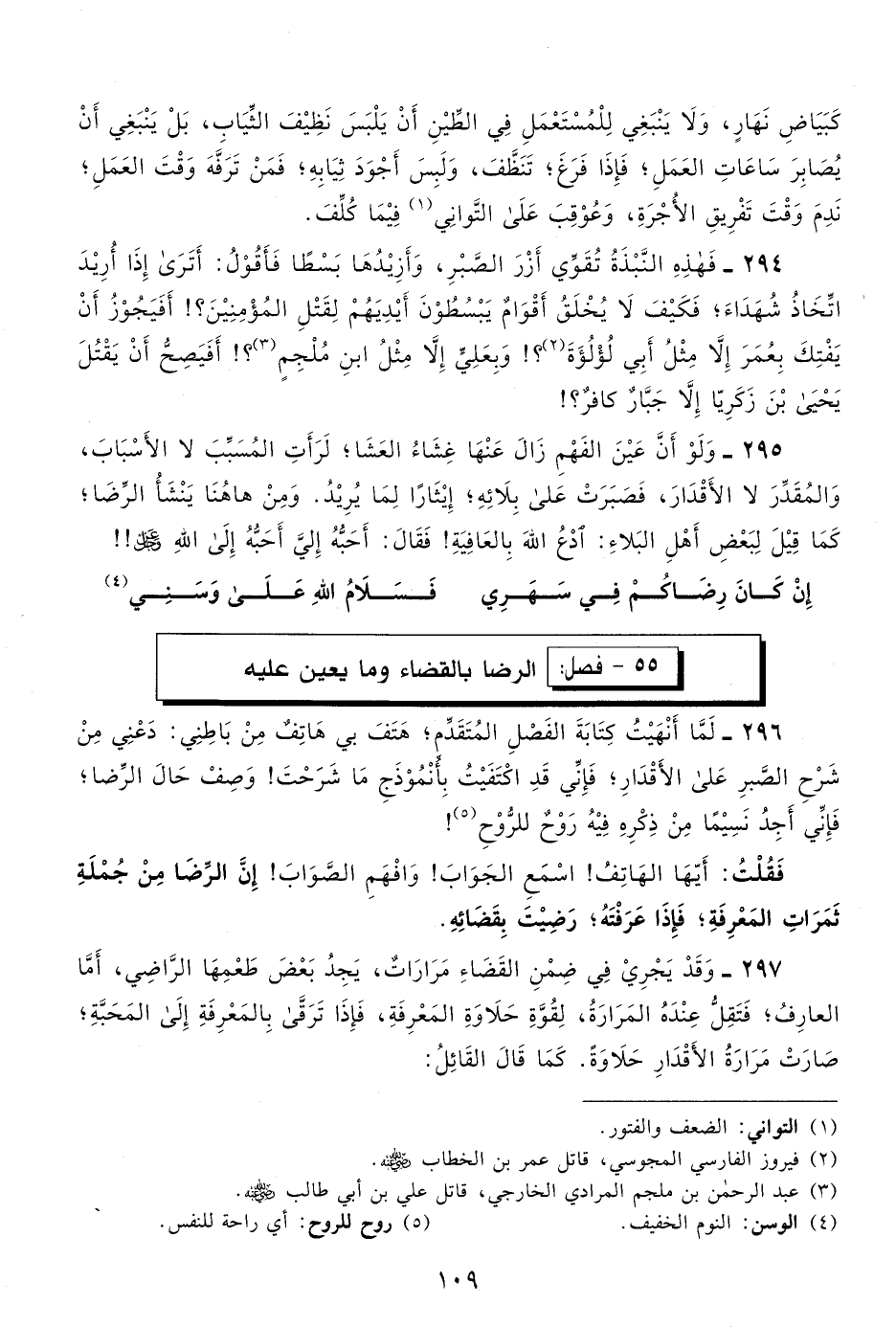 296- لما أنهيت كتابة الفصل المتقدم، هتف بي هاتف من باطني: دعني من شرح الصبر على الأقدار، فإني قد اكتفيت بأنموذج ما شرحت! وصف حال الرضا، فإني أجد نسيمًا من ذكره فيه روح للروح1!