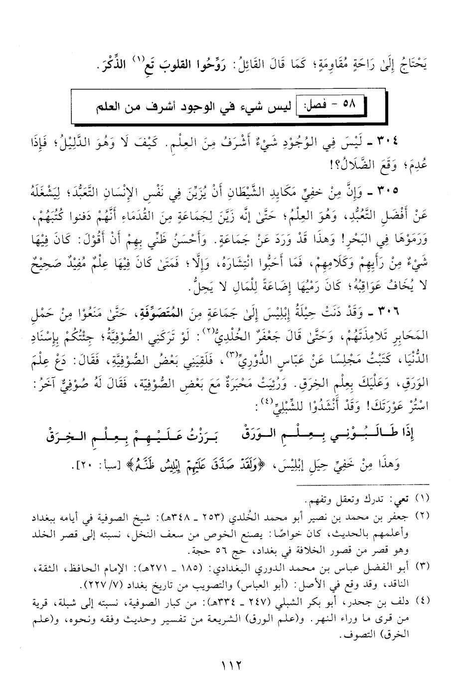 306- وقد دنت حيلة إبليس إلى جماعة من المتصوفة، حتى منعوا من حمل المحابر تلامذتهم، وحتى قال جعفر الخلدي2: لو تركني الصوفية، جئتكم بإسناد الدنيا، كتبت مجلسًا عن عباس الدوري3، فلقيني بعض الصوفية، فقال: دع علم الورق، وعليك بعلم الخرق. ورئيت محبرة مع بعض الصفوية، فقال له صوفي آخر: استر عورتك! وقد أنشدوا للشبلي4: