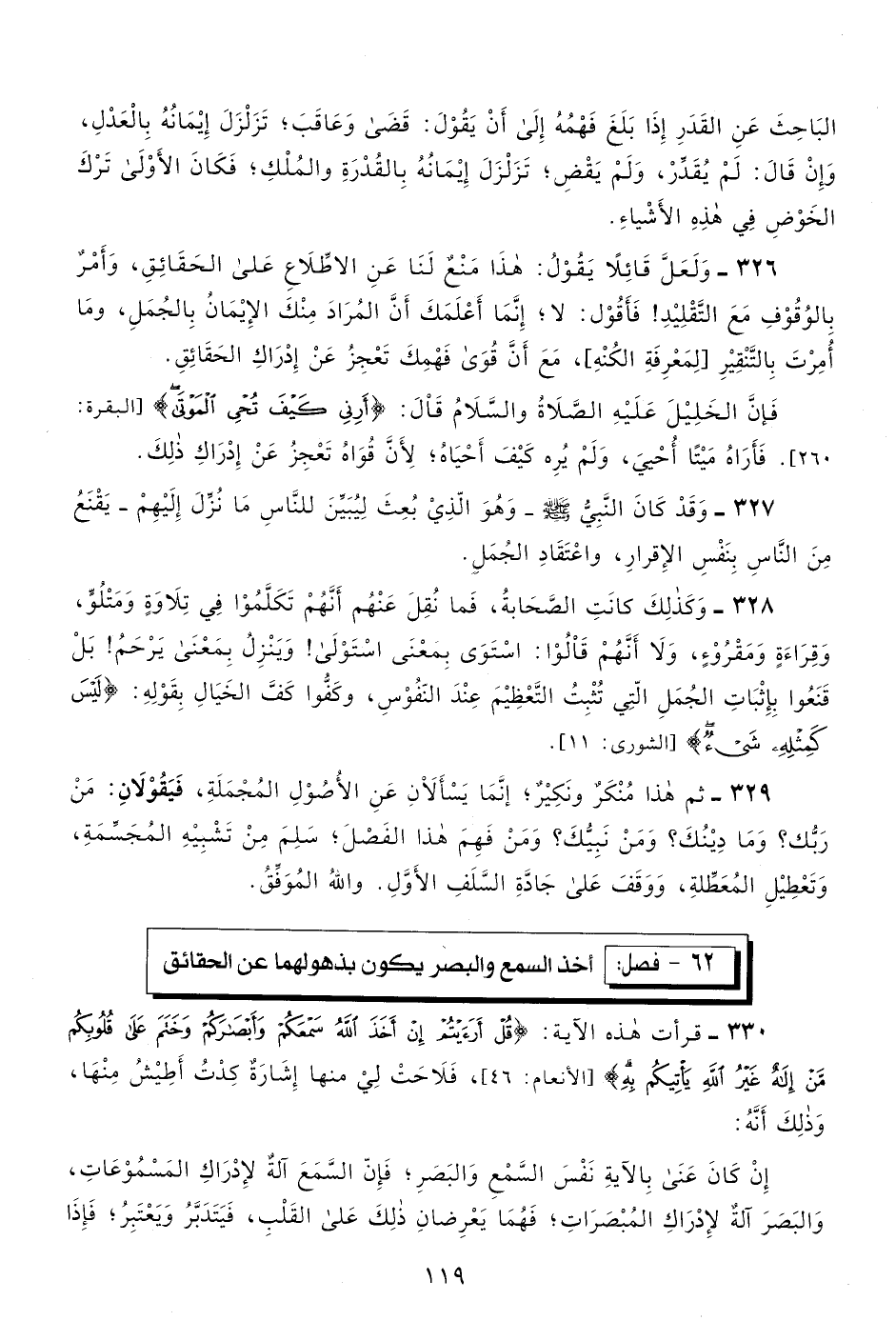 326- ولعل قائلًا يقول: هذا منع لنا عن الاطلاع على الحقائق، وأمر بالوقوف مع التقليد! فأقول: لا، إنما أعلمك أن المراد منك الإيمان بالجمل، وما أمرت بالتنقير "لمعرفة الكنه"، مع أن قوى فهمك تعجز عن إدراك الحقائق.
