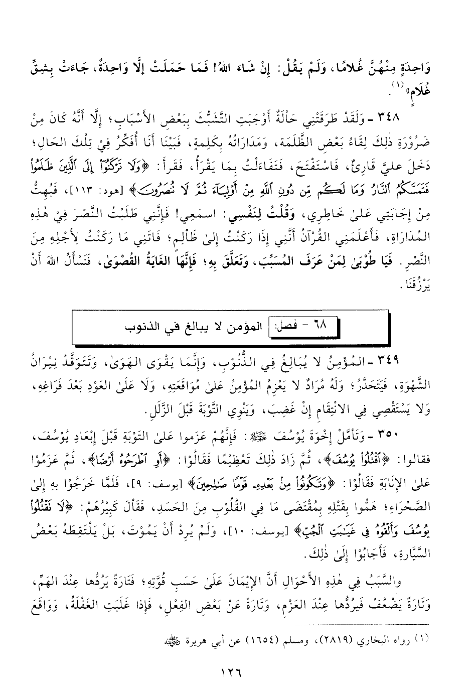 349- المؤمن لا يبالغ في الذنوب، وإنما يقوى الهوى، وتتوقد نيران الشهوة، فيتحدر، وله مراد لا يعزم المؤمن على مواقعته، ولا على العود بعد فراغه، ولا يستقصي في الانتقام إن غضب، وينوي التوبة قبل الزلل.