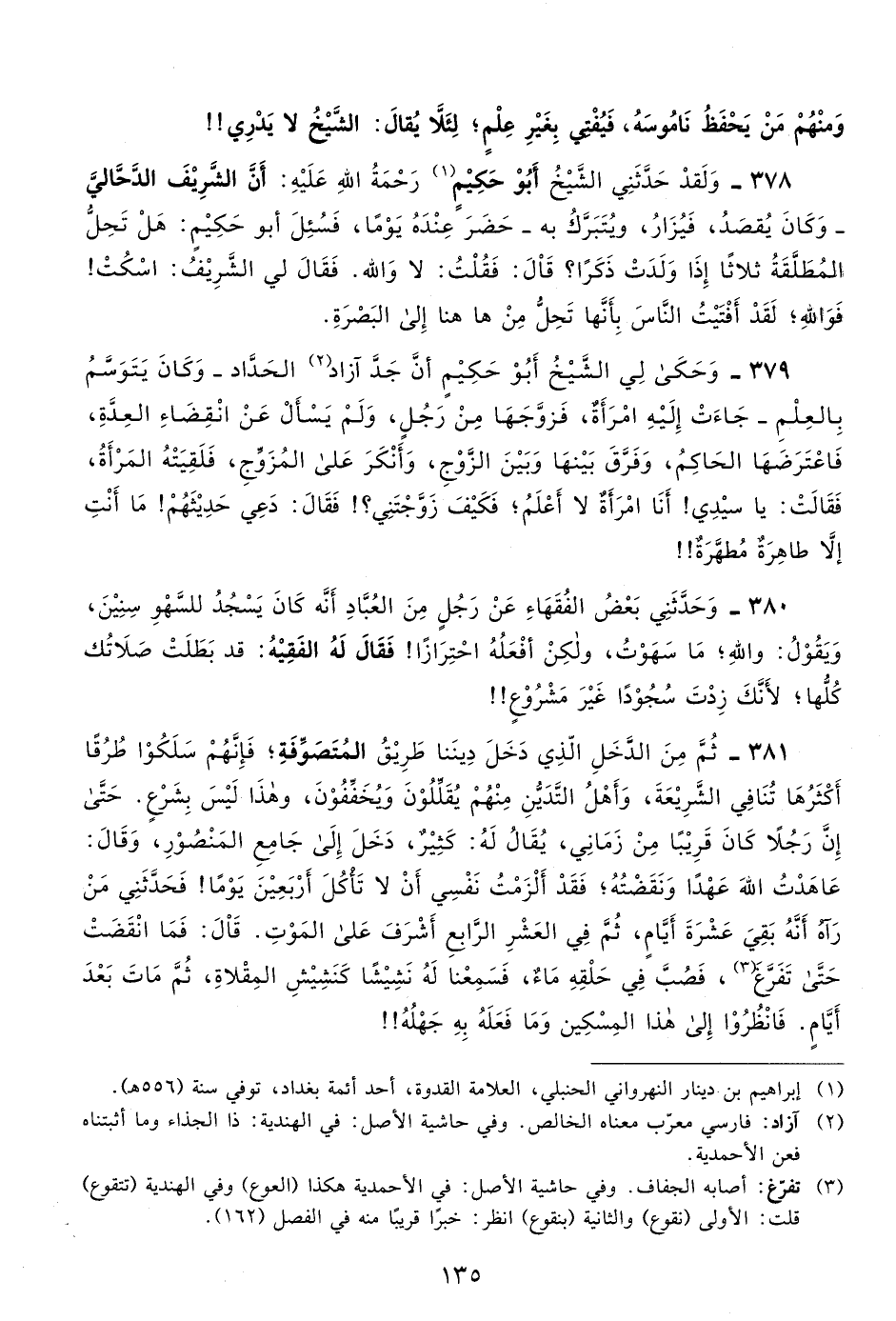 379- وحكى لي الشيخ أبو حكيم أن جد آزاد2 الحداد -وكان يتوسم بالعلم- جاءت إليه امرأة، فزوجها من رجل، ولم يسأل عن انقضاء العدة، فاعترضها الحاكم، وفرق بينها وبين الزوج، وأنكر على المزوج، فلقيته المرأة، فقالت: يا سيدي! أنا امرأة لا أعلم، فكيف زوجتني؟! فقال: دعي حديثهم! ما أنت إلا طاهرة مطهرة!!
