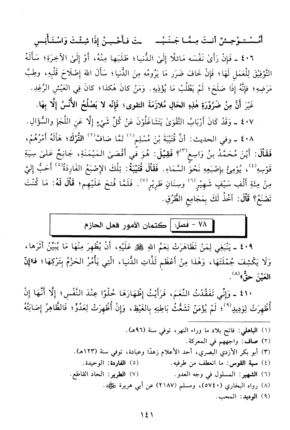408- وفي الحديث: أن قتيبة بْنَ مُسْلِمٍ1 لما صاف2 الترك، هاله أمرهم، فقال: أين محمد بن واسع3؟ فقيل: هو في أقصى الميمنة، جانح على سية قوسه4، يوميء بإصبعه نحو السماء. فقال قتيبة: تلك الإصبع الفاردة5 أحب إلى من مئة ألف سيف شهير6 وسنان طرير7. فلما فتح عليهم؛ قال له: ما كنت تصنع؟ قال: آخذ لك بمجامع الطرق.