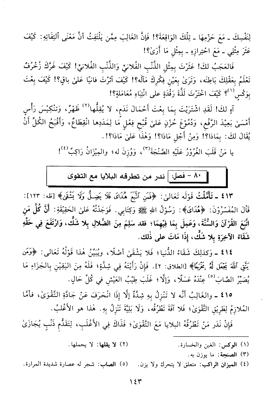 415- والغالب أنه لا تنزل به شدة إلا إذا انحرف عن جادة التقوى، فأما الملازم لطريق التقوى، فلا آفة تطرقه، ولا بلية تنزل به، هذا هو الأغلب.