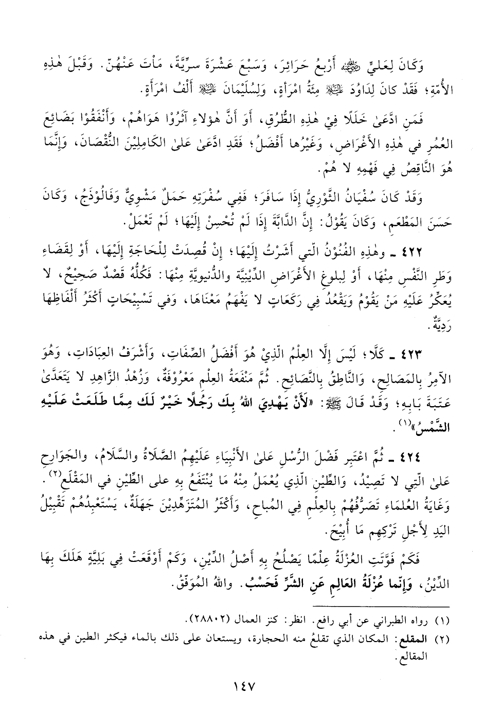 423- كلا، ليس إلا العلم الذي هو أفضل الصفات، وأشرف العبادات، وهو الآمر بالمصالح، والناطق بالنصائح. ثم منفعة العلم معروفة، وزهد الزاهد لا يتعدى عتبة بابه، وقد قال صلى الله عليه وسلم: "لأن يهدي الله بك رجلًا خير لك مما طلعت عليه الشمس"1.