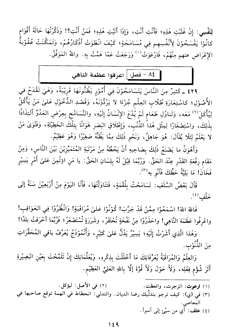 429- كثير من الناس يتسامحون في أمور يظنونها قريبة، وهي تقدح في الأصول، كاستعارة طلاب العلم جزءًا لا يردونه، وقصد الدخول على من يأكل ليأكل1 معه، وتناول طعام لم يدع الإنسان إليه، والتسامح بعرض العدو التذاذًا بذلك، واستصغارًا لمثل هذا الذنب، وإطلاق البصر هوانًا بتلك الخطيئة، وفتوى من لا يعلم لئلَّا يقال: هو جاهل، ونحو ذلك مما يظنه صغيرًا وهو عظيم.