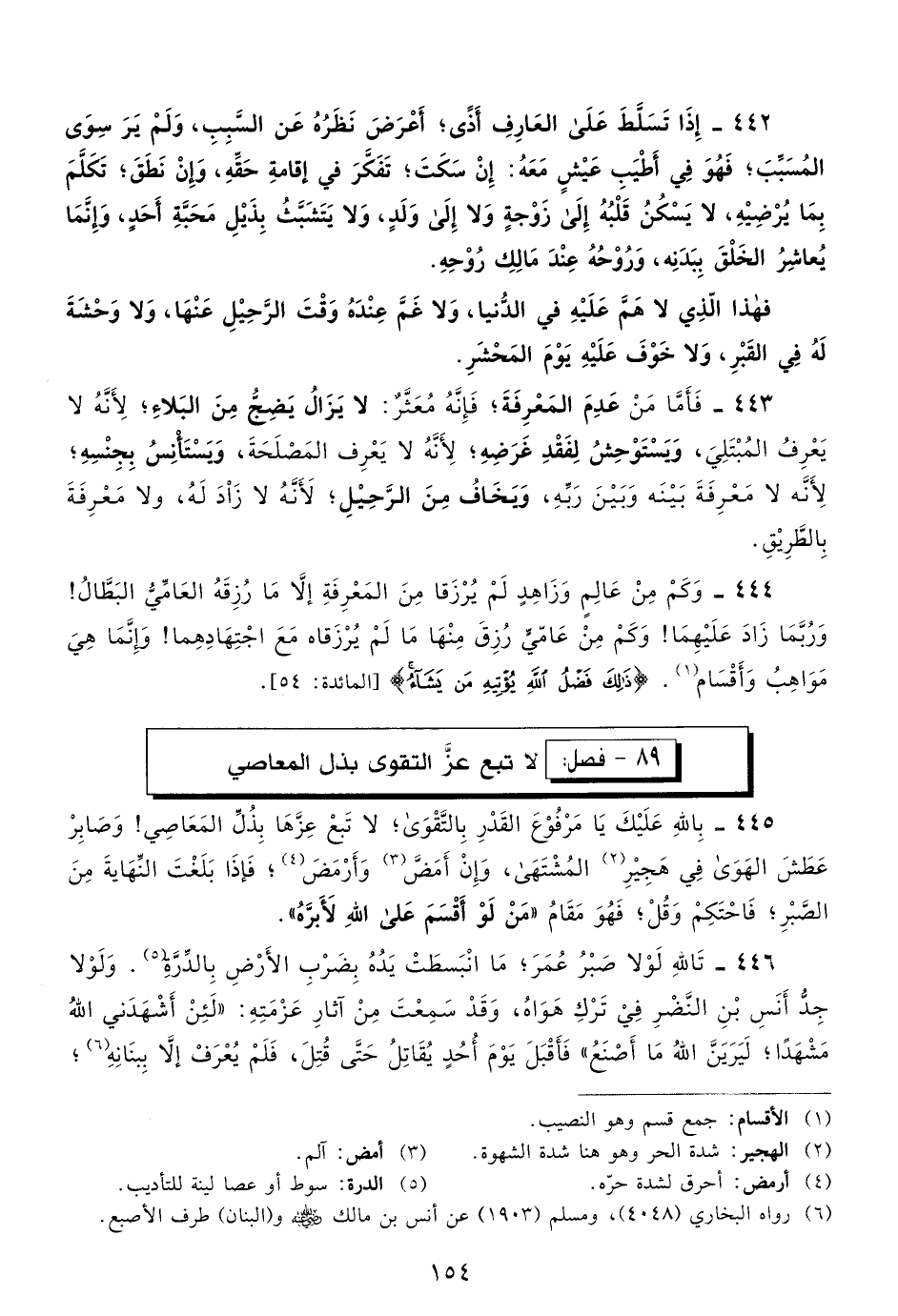 445- بالله عليك يا مرفوع القدر بالتقوى، لا تبع عزها بذل المعاصي! وصابر عطش الهوى في هجير1 المشتهى، وإن أمض2 وأرمض3، فإن بلغت النهاية من الصبر، فاحتكم وقل، فهو مقام "من لو أقسم على الله لأبره".