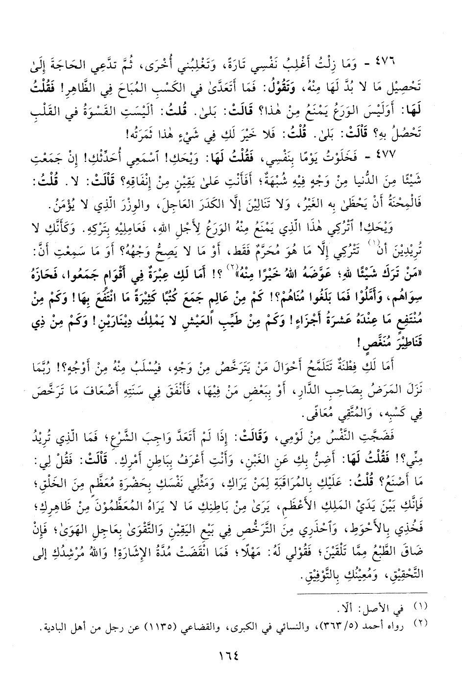 476- ومازلت أغلب نفسي تارةً، وتغلبني أخرى، ثم تدعي الحاجة إلى تحصيل ما لا بد لها منه، وتقول: فما أتعدى في الكسب المباح في الظاهر! فقلت لها: أو ليس الورع يمنع من هذا؟ قالت: بلى، قلت: أليست القسوة في القلب تحصل به؟ قالت: بلى. قلت: فلا خير لك في شيء هذا ثمرته!