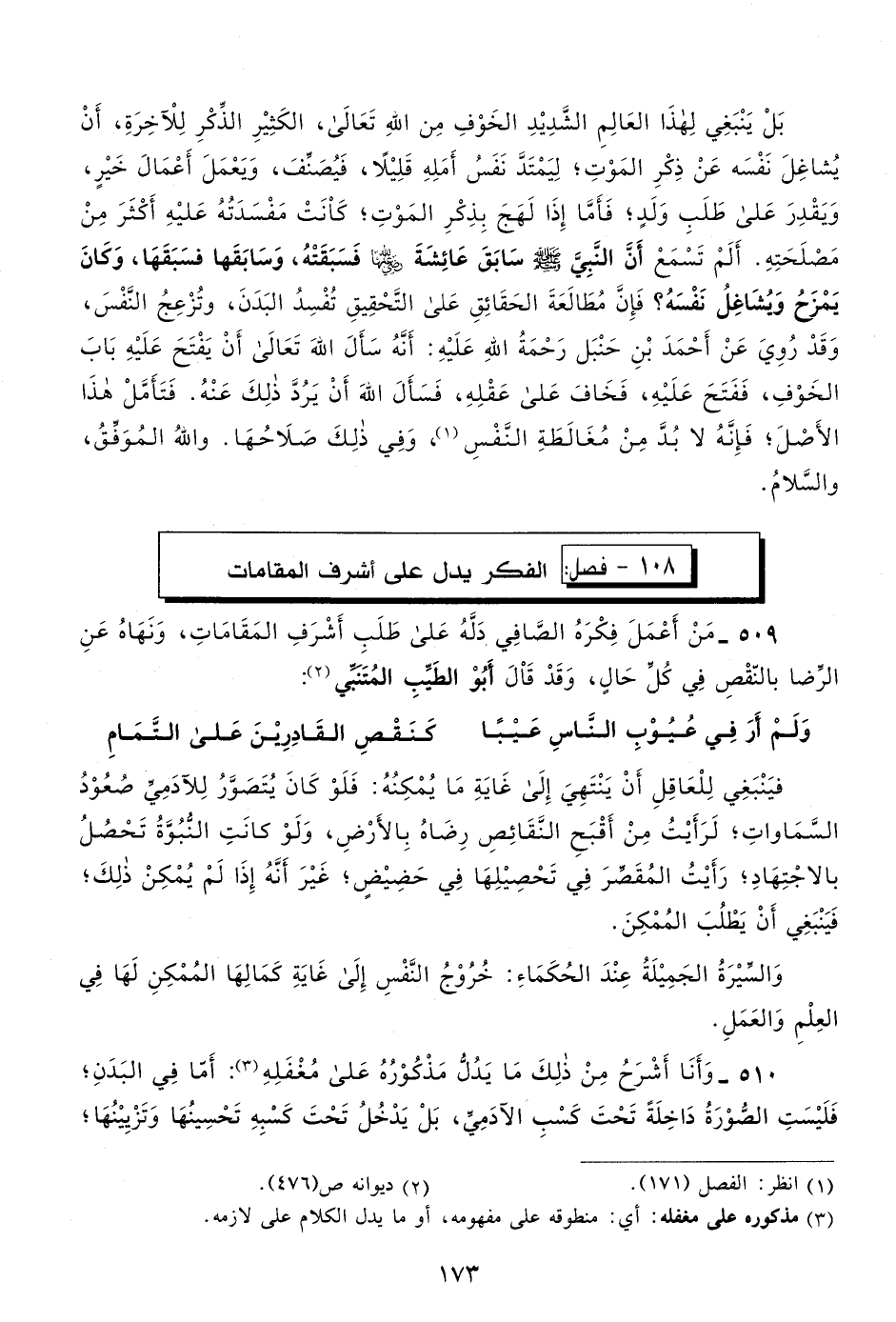509- من أعمل فكره الصافي؛ دله على طلب أشرف المقامات، ونهاه عن الرضا بالنقص في كل حال، وقد قال أبو الطيب المتنبي1: