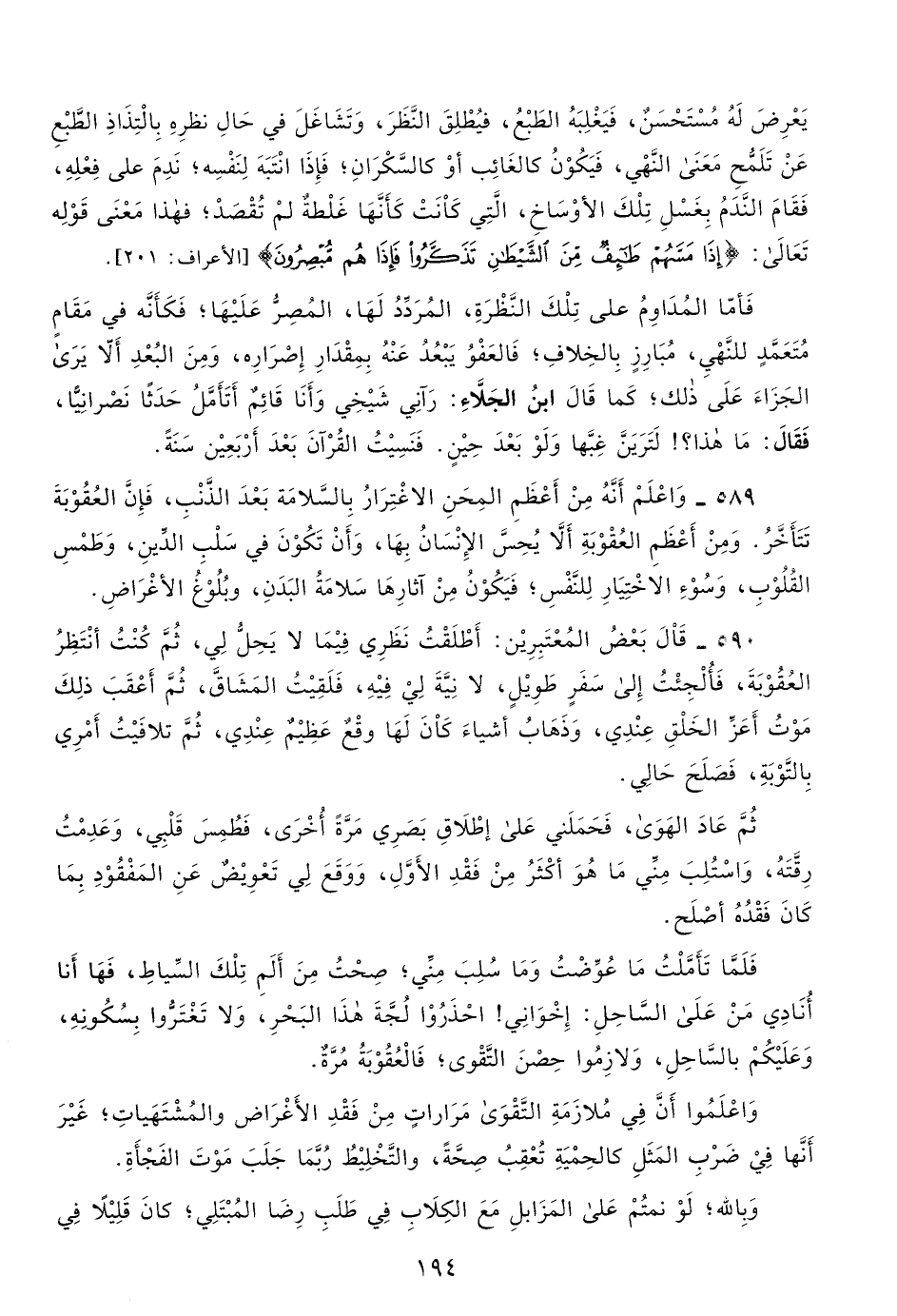 589- واعلم أنه من أعظم المحن الاغترار بالسلامة بعد الذنب، فإن العقوبة تتأخر. ومن أعظم العقوبة ألا يحس اإنسان بها، وأن تكون في سلب الدين، وطمس القلوب، وسوء الاختيار للنفس، فيكون من آثارها سلامة البدن، وبلوغ الأغراض.