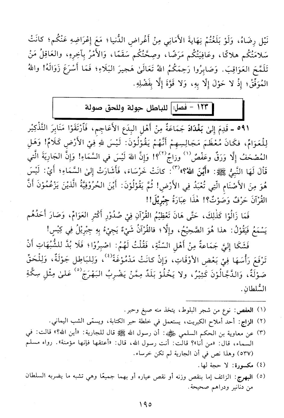 591- قدم إلى بغداد جماعة من أهل البدع الأعاجم، فارتقوا منابر التذكير للعوام، فكان معظم مجالسهم أنهم يقولون: ليس لله في الأرض كلام! وهل المصحف إلا ورق وعفص1 وزاج2؟! وإن الله ليس في السماء! وإن الجارية التي قال لها النبي صلى الله عليه وسلم: "أين الله؟ "3: كانت خرساء، فأشارت إلى السماء، أي: ليس هو من الأصنام التي تعبد في الأرض! ثم يقولون: أين الحروفية الذين يزعمون أن القرآن حرف وصوت؟! هذا عبارة جبريل!!