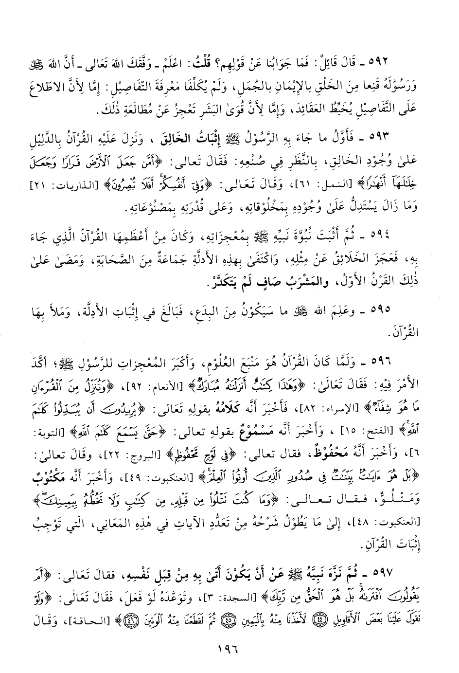 594- ثم أثبت نبوة نبيه صلى الله عليه وسلم بمعجزته، وكان من أعظمها القرآن الذي جاء به، فعجز الخلائق عن مثله، واكتفى بهذه الأدلة جماعة من الصحابة، ومضى على ذلك القرن الأول، والمشرب صاف لم يتكدر.