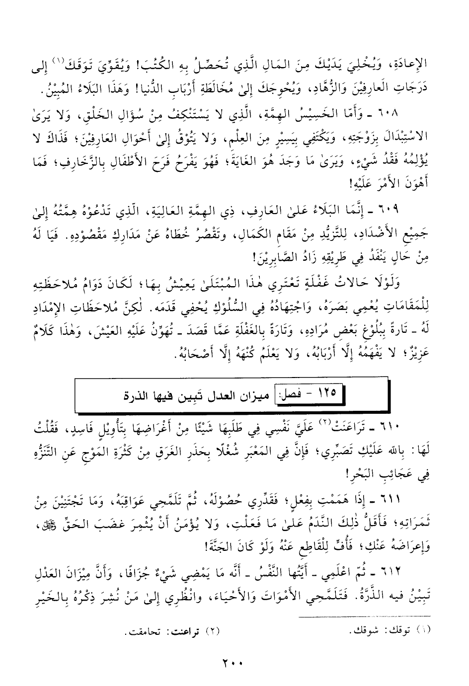 608- وأما الخسيس الهمة، الذي لا يستنكف من سؤال الخلق، ولا يرى الاسبتدال بزوجته، ويكتفي بيسير من العلم، ولا يتوق إلى أحوال العارفين، فذاك لا يؤلمه فقد شيء، ويرى ما وجد هو الغاية، فهو يفرح فرح الأطفال بالزخارف، فما أهون الأمر عليه!