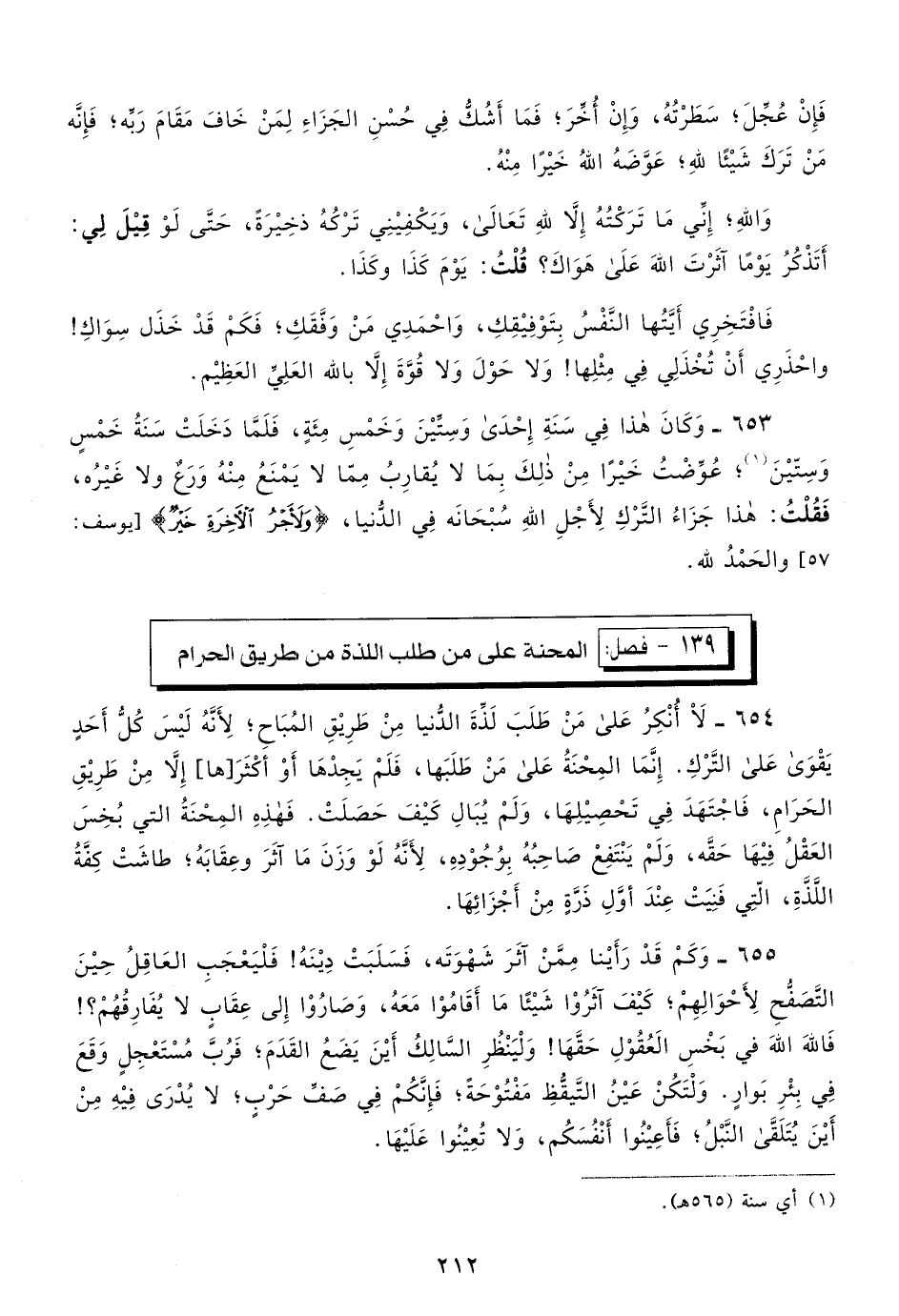 654- لا أنكر على من طلب لذة الدنيا من طريق المباح؛ لأنه ليس كل أحد يقوى على الترك. إنما المحنة على من طلبها، فلم يجدها أو أكثرها إلا من طريق الحرام، فاجتهد في تحصيلها، ولم يبال كيف حصلت. فهذه المحنة التي بخس العقل فيها حقه، ولم ينتفع صاحبه بوجوده؛ لأنه لو وزن ما آثر وعقابه، طاشت كفة اللذة، التي فنيت عند أول ذرة من أجزائها.